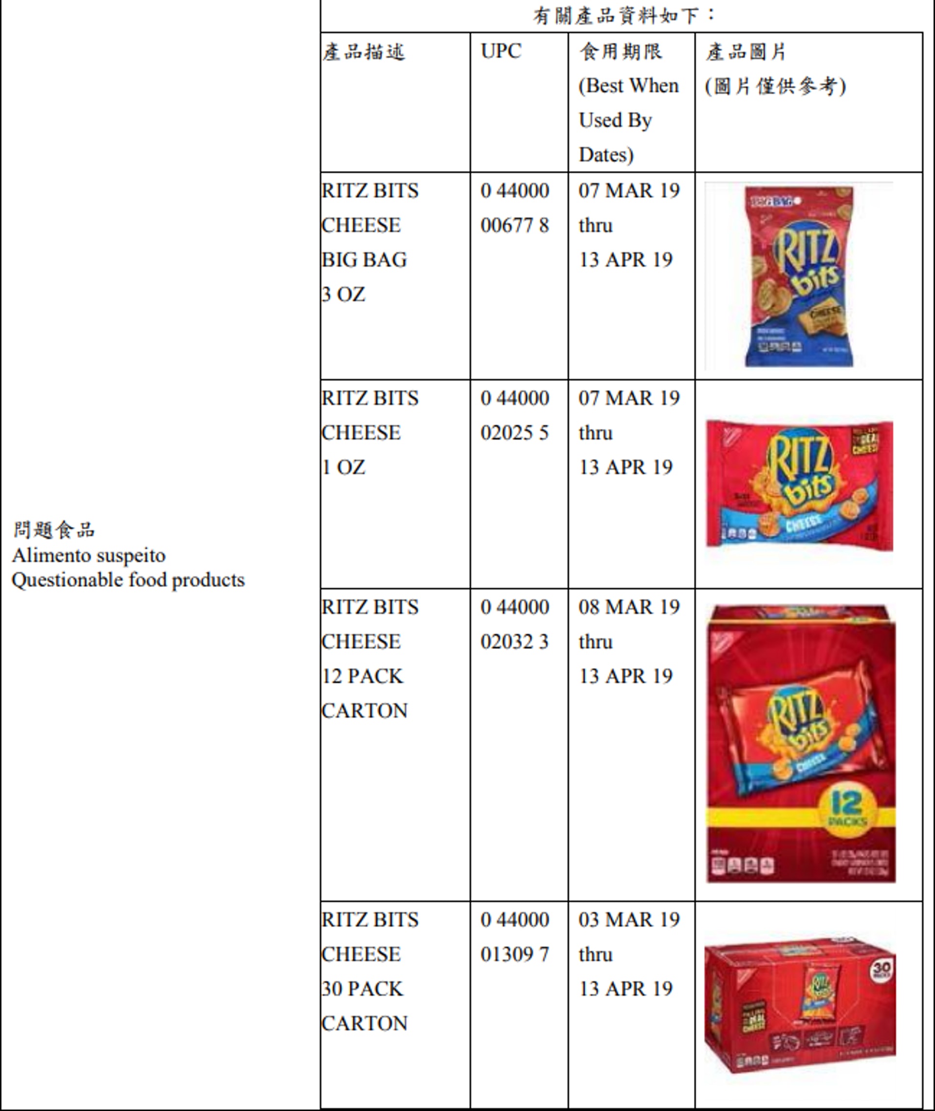/ H7 S- f6 Y' r$ {2 P! D+ l4 Y' Oos.tvboxnow.com根據美國食品藥物管理局及Mondelēz Global LLC的公告所示,需要召回的產品有10多款,包括不同包裝的芝士夾心餅乾(Ritz Bits Cheese Cracker Sandwiches)、芝士夾心餅(Ritz Cheese Cracker Sandwiches)等,產品食用有效日由2019年1月14日至4月13日不等。公告中又指,現階段未收到感染投訴,回收行動只屬預防措施。