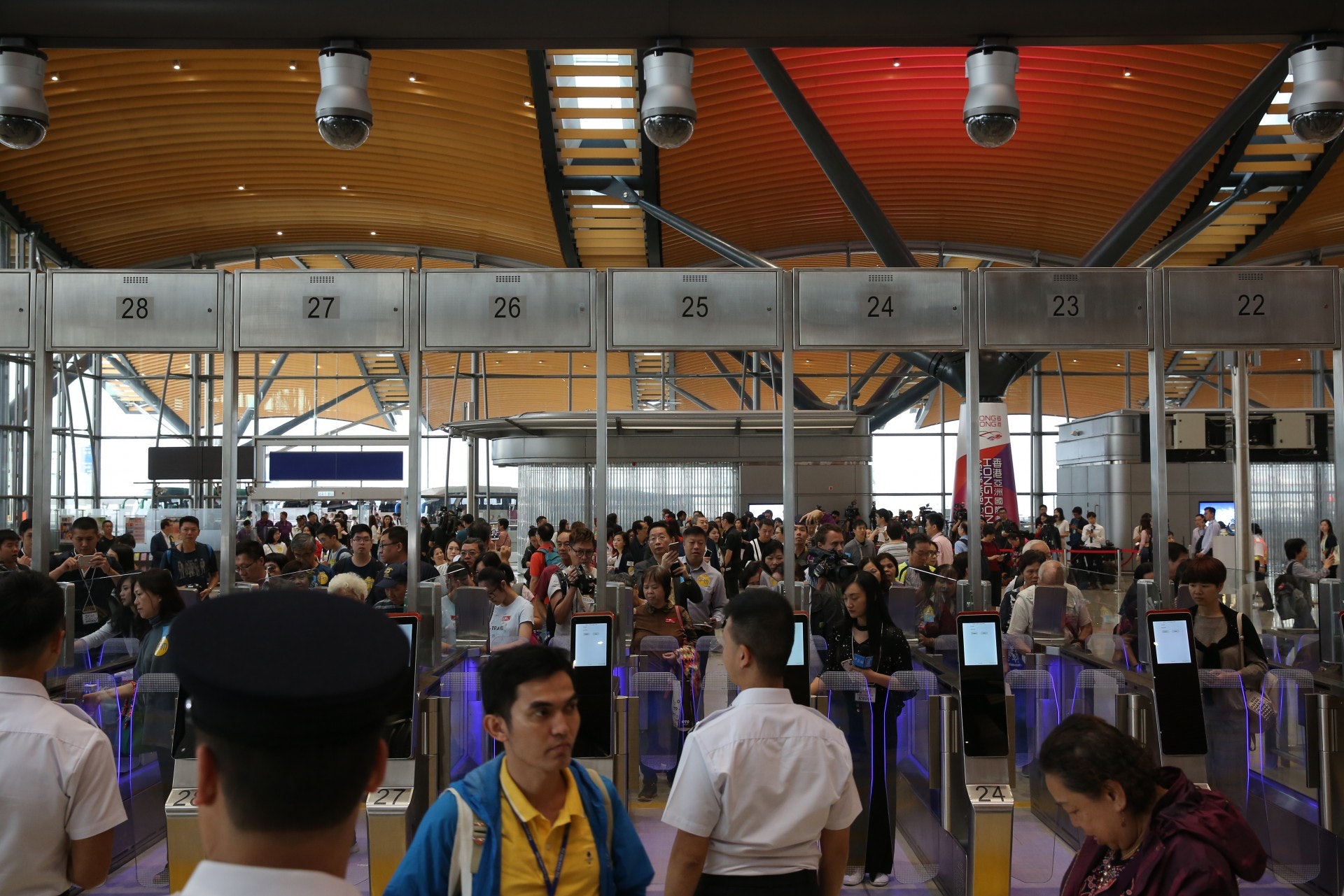 當市民進入旅檢大樓、準備過關時,其中一部自動過境閘機因市民身份證黐滿膠紙,一度令閘機未能正常運作。(黃雅盈攝)os.tvboxnow.com% `" C5 P( ^- Y