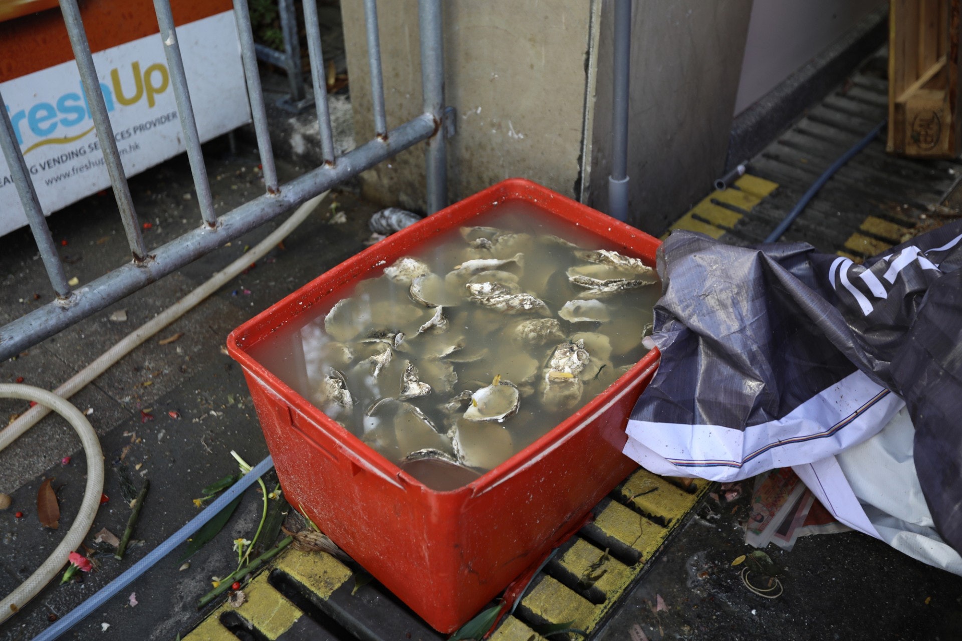 熟食攤檔的蠔肉,放在灰色液體的膠桶內。(盧翊銘攝)