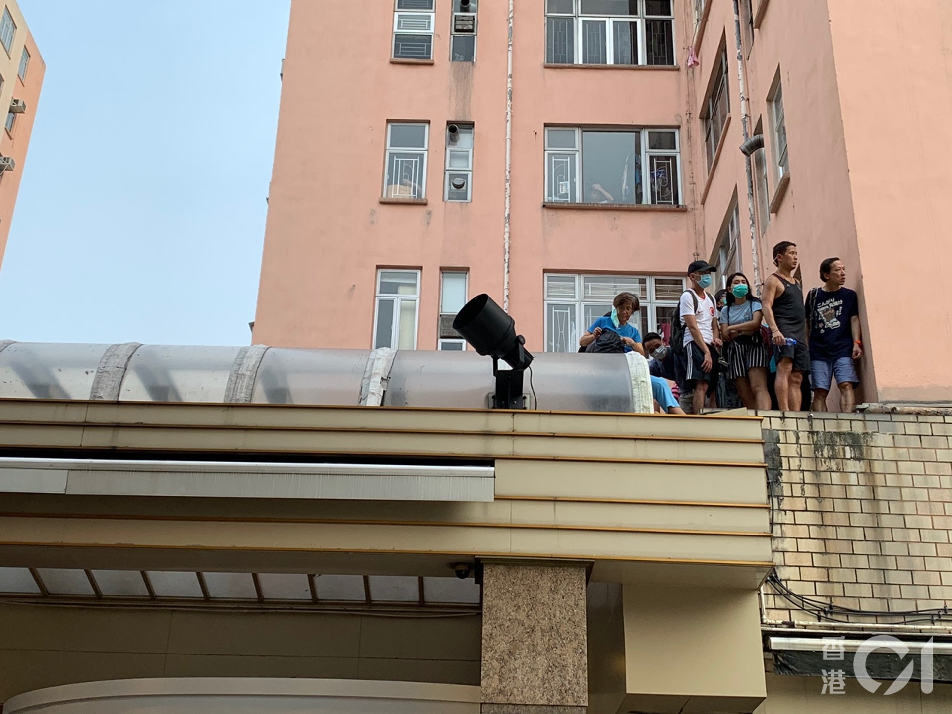 + x: w' y' V7 l; p一班居民走到狹小平台觀看,距地面高度約4至5米。(梁煥敏攝)