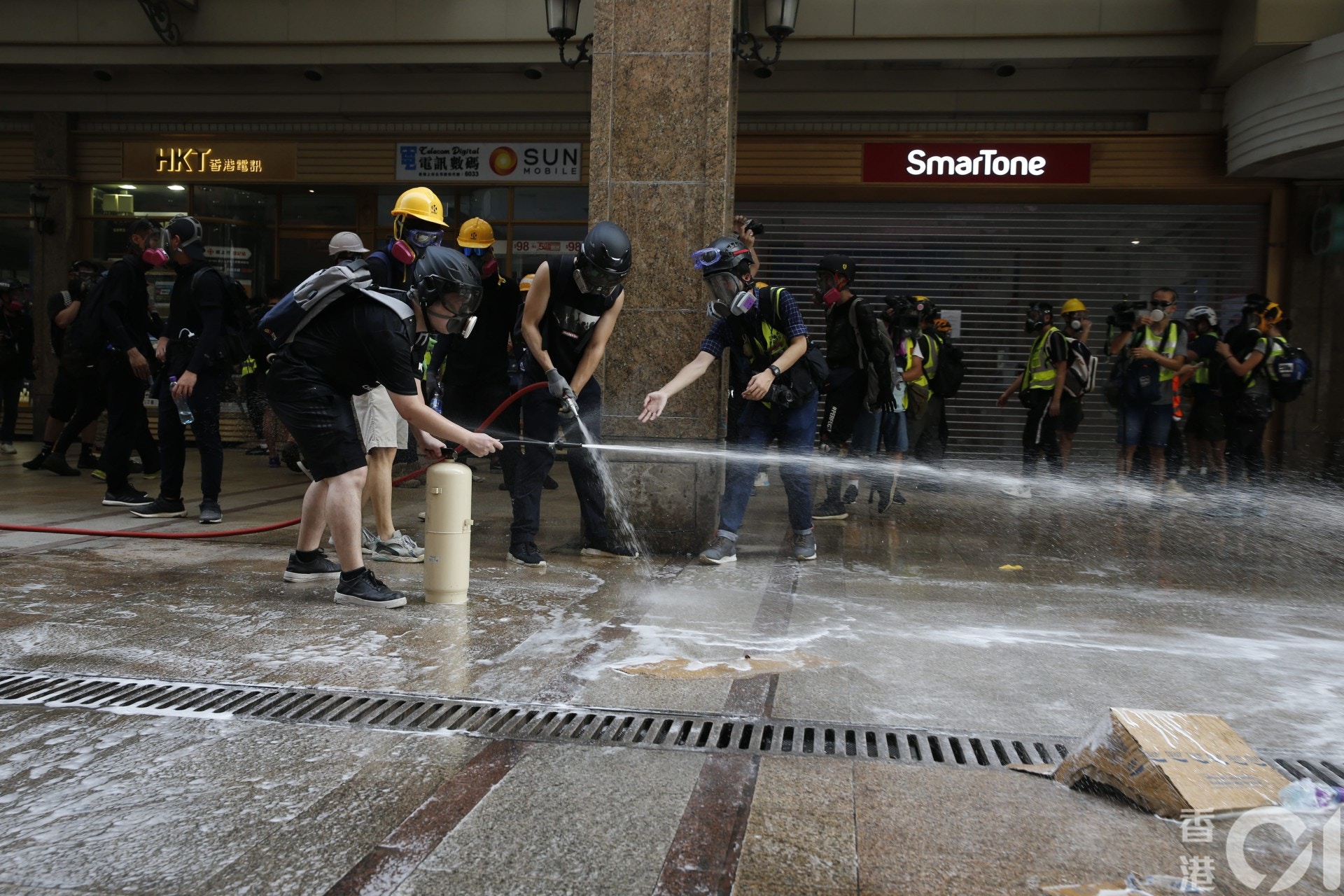 ; M5 `( n. ?- l3 g6 l示威者向防暴警察噴水,又在地上傾倒清潔劑。(梁鵬威攝)