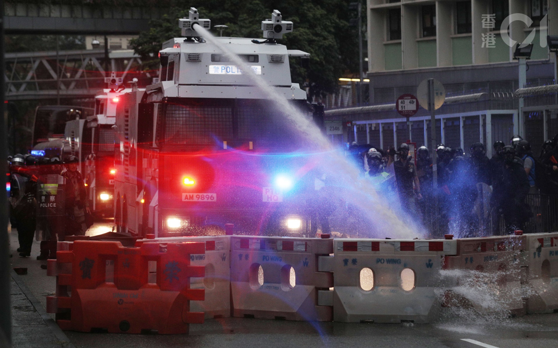 警方的水炮車到場,大約6時首次在實戰中射水,射向示威者設置的水馬路障。(余俊亮攝) ; K5 w& q* Z' p1 h* Ktvb now,tvbnow,bttvb- k+ V' M1 s$ T: ?& s