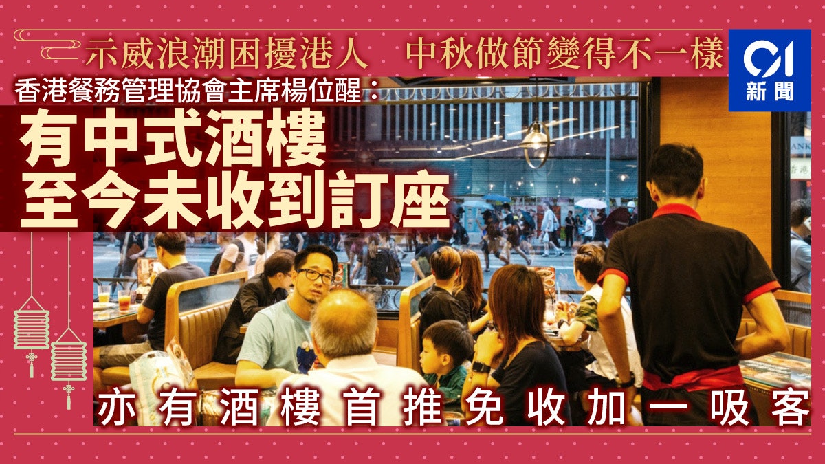 本周五(13日)是人月兩團圓的中秋佳節,惟反修例風波持續,港人節慶氣氛冷淡,餐飲業、旅遊業等市道慘淡。《香港01》日前致電九龍區的餐飲集團,均表示中秋正日(13日)包房已訂滿,而大廳仍有位預訂,有食肆稱若食客提早落訂「全包宴」,可獲原價再減200元,及免費送指定飲品。
