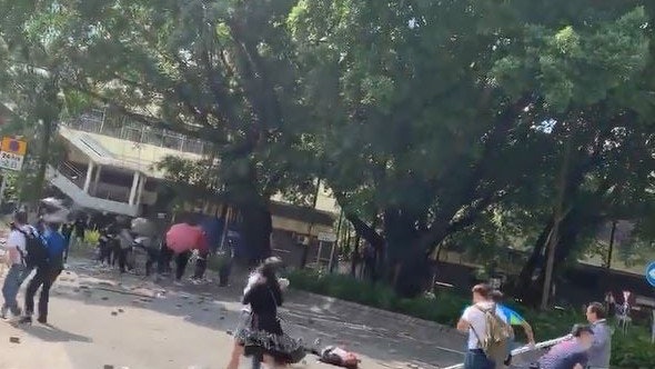 9 k0 T- m" C4 a: b' A2 @8 o另一條網上片段則可見,現場有多名人士,不斷向示威者掟磚及叫罵,有女士高叫「走啦!死曱甴」,示威者後退並開傘抵擋,期間一名70歲外判清潔男工,懷疑受傷倒地不起,防暴警其後到場施放催淚彈驅散。 |