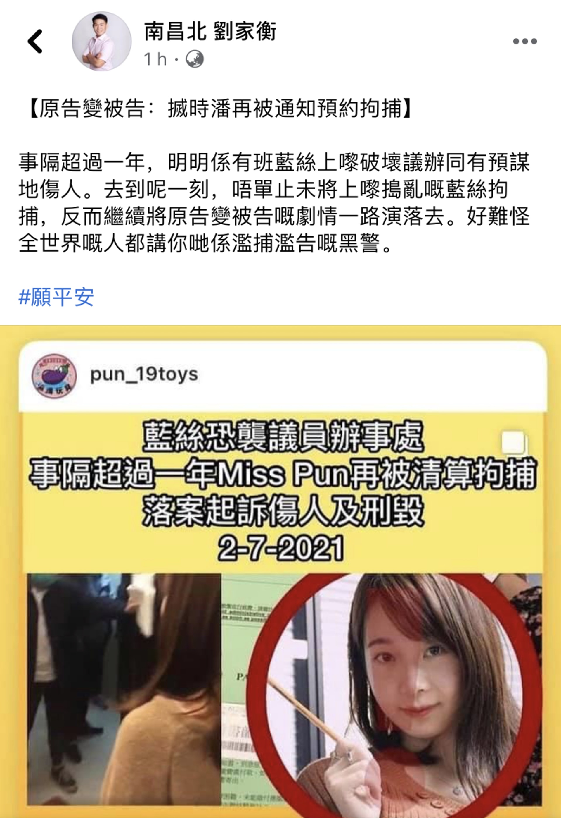 潘的丈夫,即前深水埗區議員劉家衡,其議員辦事處於去年曾貼出「藍絲與狗不得內進」的告示。有人對此不滿並在群起到其議辦門口引發爭執並引發衝突,期間有人涉向到來爭議的人士潑漂白水。# \ Y% D2 H0 j6 J4 p