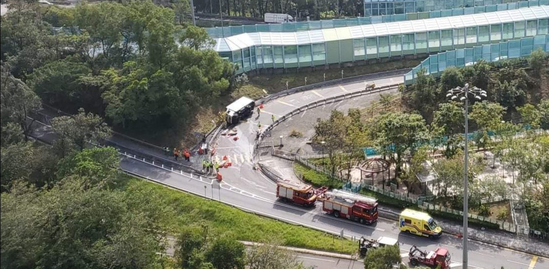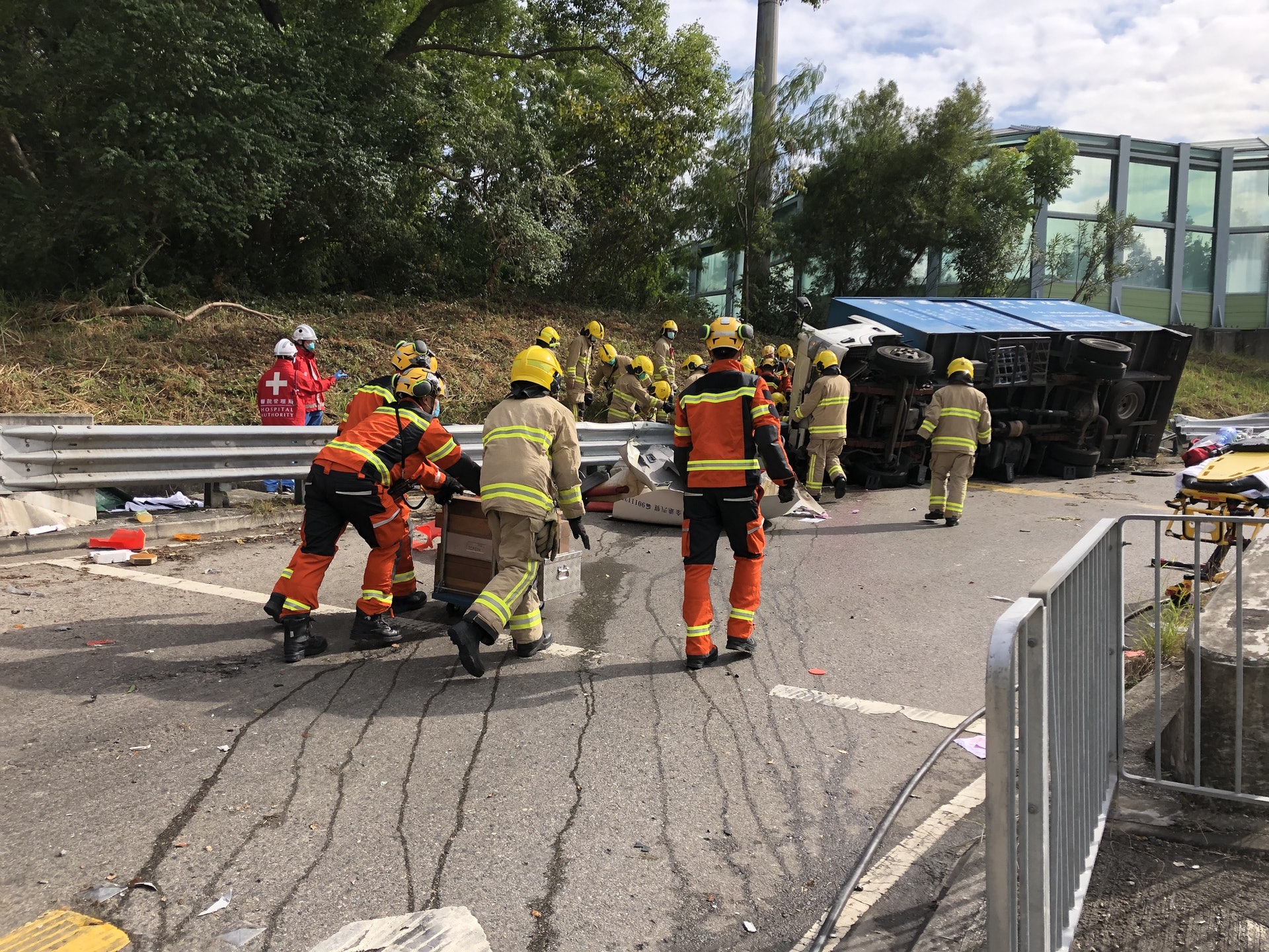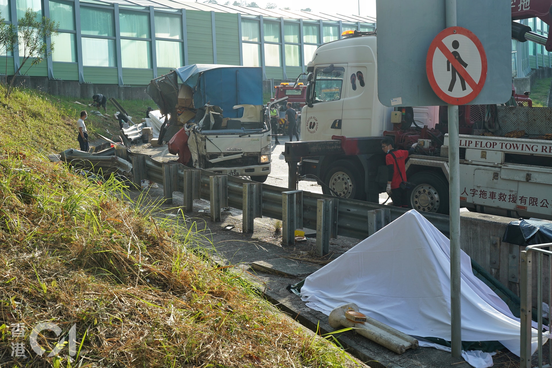 . `5 {/ U- O) p, s大埔吐露港公路發生恐怖車禍,一輛貨車失控翻側撞欄,司機身首異處慘死。今(18日)中午12時28分,吐露港公路往九龍方向至近廣福邨支路,一輛載有裝修材料的港粵國際貿易有限公司貨車,疑失控自炒後向右翻側撞欄,51歲姓林貨車司機頸部遭防撞欄劏開,身體被困駕駛室內,車上一名23歲姓鄭男乘客則雙手輕微擦傷,自行離開車廂。消防員趕抵現場,利用工具鎅開駕駛室拯救被困車底的司機,醫療隊及坍塌搜救專隊到場協助,近兩小時後將司機救出,惜證實當場不治。警員架起帳篷將遺體遮蓋調查,向乘客了解肇事原因。tvb now,tvbnow,bttvb7 F% C3 ~* e5 v# h: n* I