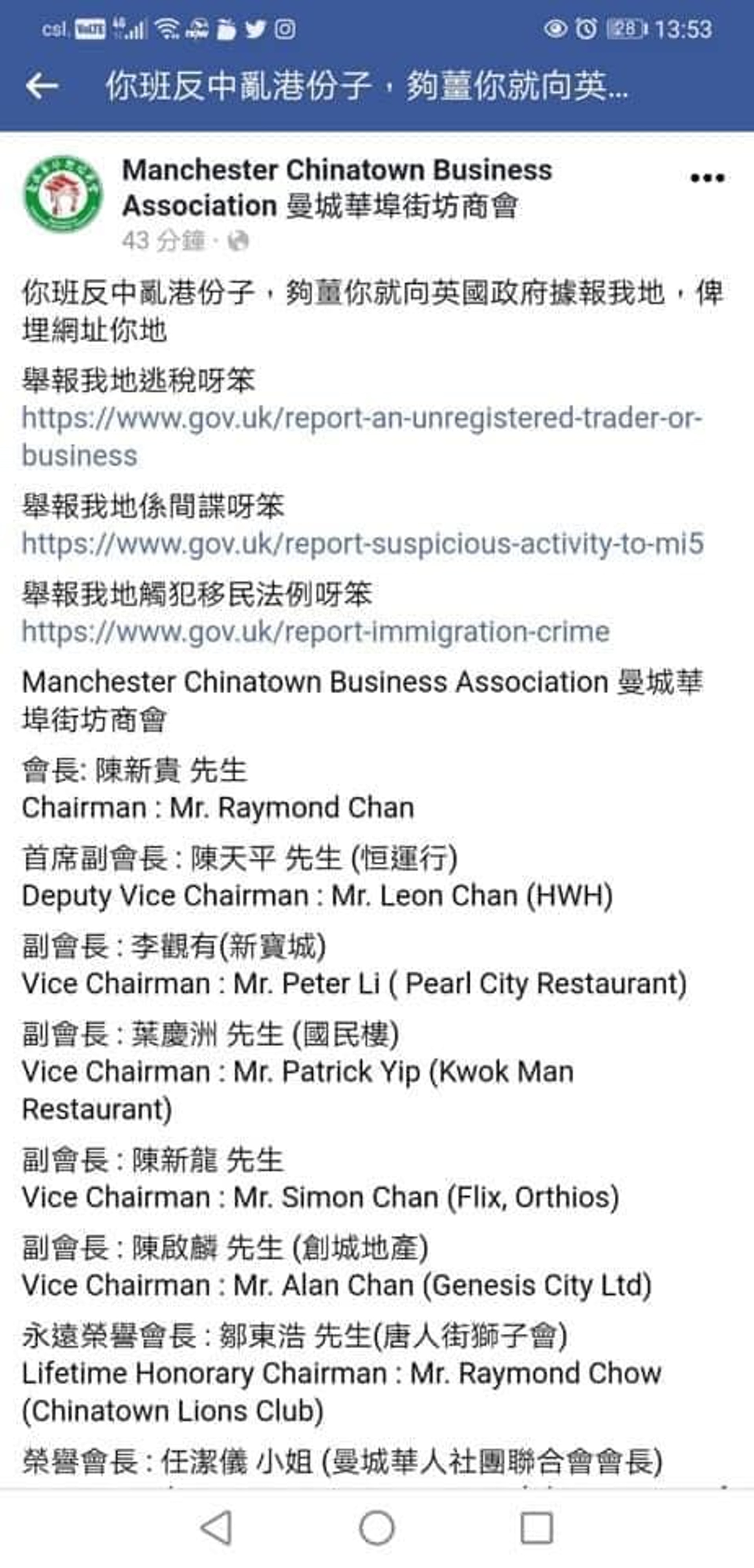 風波始於一個於本月12日在倫敦舉行的集會,「曼城華埠街坊商會」本月16日在Facebook專頁發文,稱「廢青亂港分子」在倫敦發起集會,認為「遲早都會搞到曼城(曼徹斯特)來」,又稱要「徵求意見」,「我想徵求大家的意見,點樣去應付呢班人,"表示歡迎"或者"不歡迎"」。有關貼文惹網民炮轟,質疑這批華僑愛中國為何要移民英國。