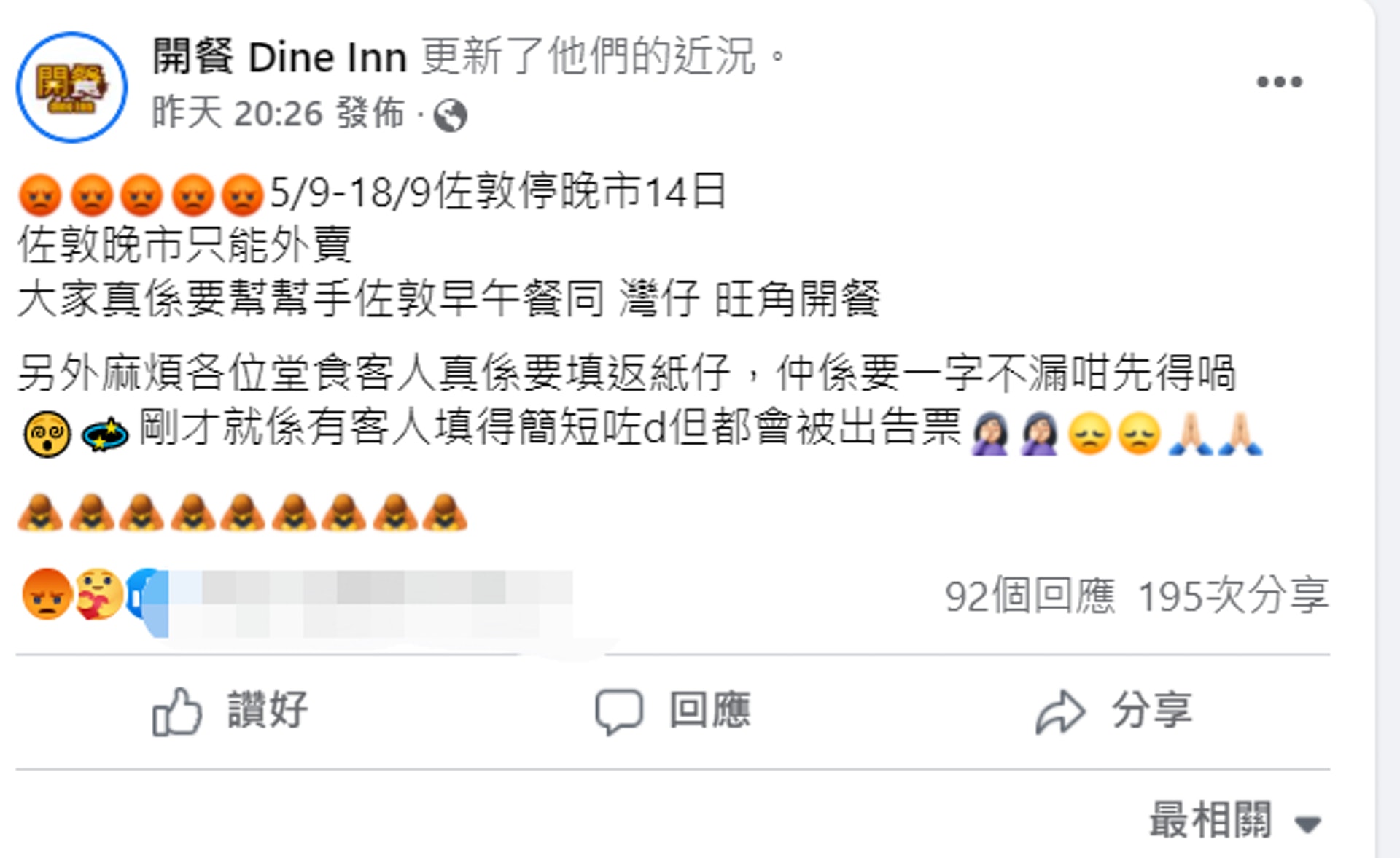 開餐佐敦店9月4日晚6時許被警員檢查,其後被指有堂食客填寫資料有問題,分店被禁止堂食14日。(「開餐 Dine Inn」Facebook圖片)