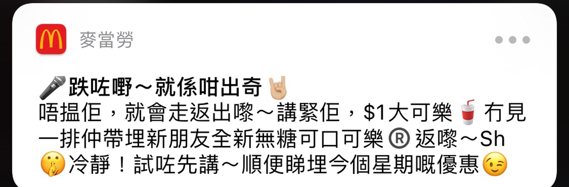 香港麥當勞早前宣布,因國際航運因不穩定影響全球供應鏈,導致脆香雞翼延遲抵港,部份分店需暫停售賣脆香雞翼直至食材恢復供應。麥當勞今日公布(27日)恢復供應脆香雞翼,並推出雞翼優惠,又透過手機app推播消息,當中以「跌咗嘢~就係咁出奇」為標題,內文提到「唔搵佢,就會出返嚟」等字句,原意相信是引用YouTube頻道「試當真」大熱歌曲《跌嘢唔好搵》歌詞作切入點宣傳,惟有巿民接收訊息後,聯想到日前有水警快艇翻沉、高級督察林婉儀不幸殉職事件,認為麥當勞宣傳的內容是暗諷女警墮海,直斥做法不能接受,掦言要抵制麥當勞,要求公司交代事件。公仔箱論壇( ?* x: t5 M7 \5 C( g) p
