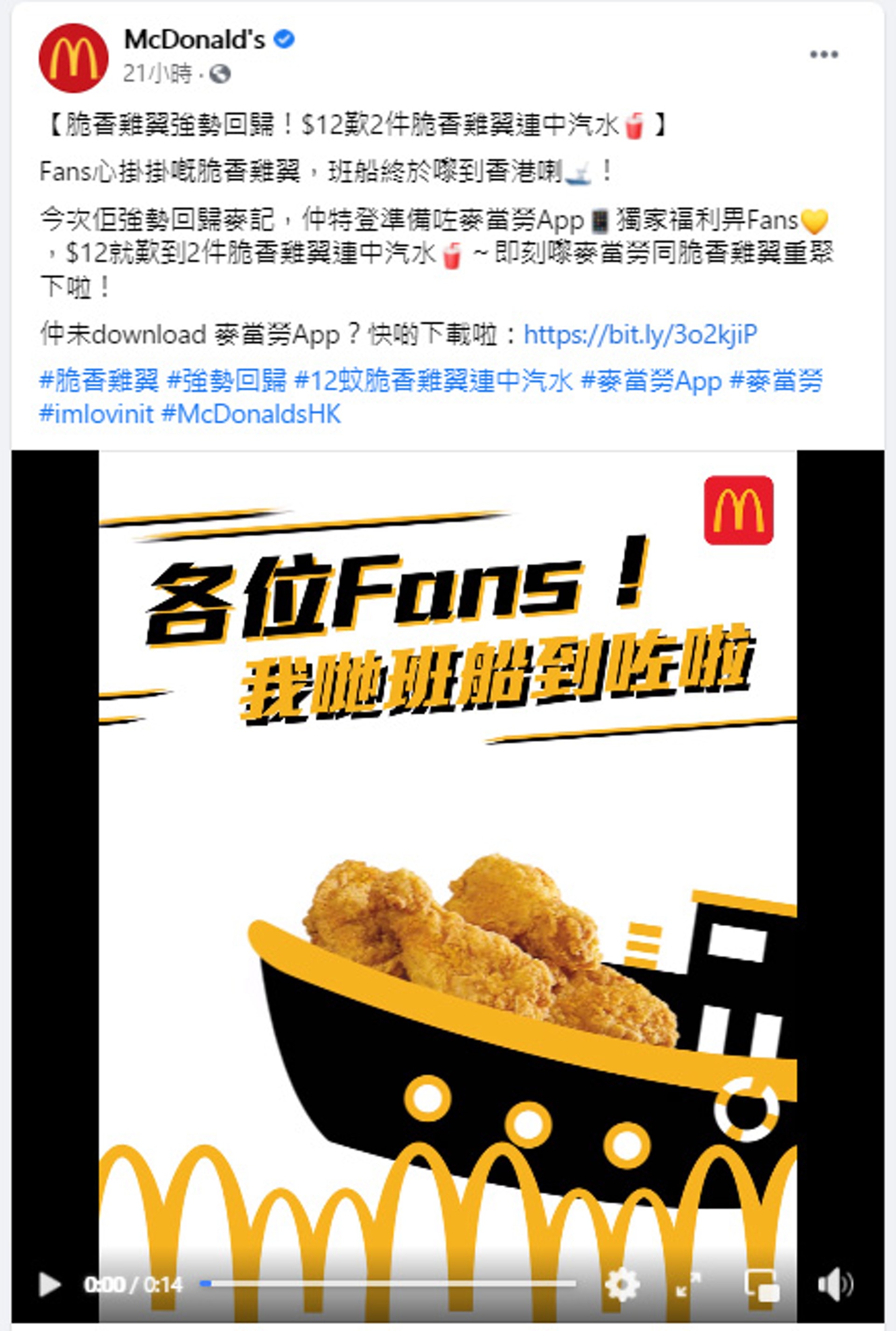 ) d- `3 I% ?1 o麥當勞昨晚(9月26日)晚上10時上載短片,指脆香雞翼恢復供應。(麥當勞fb截圖)