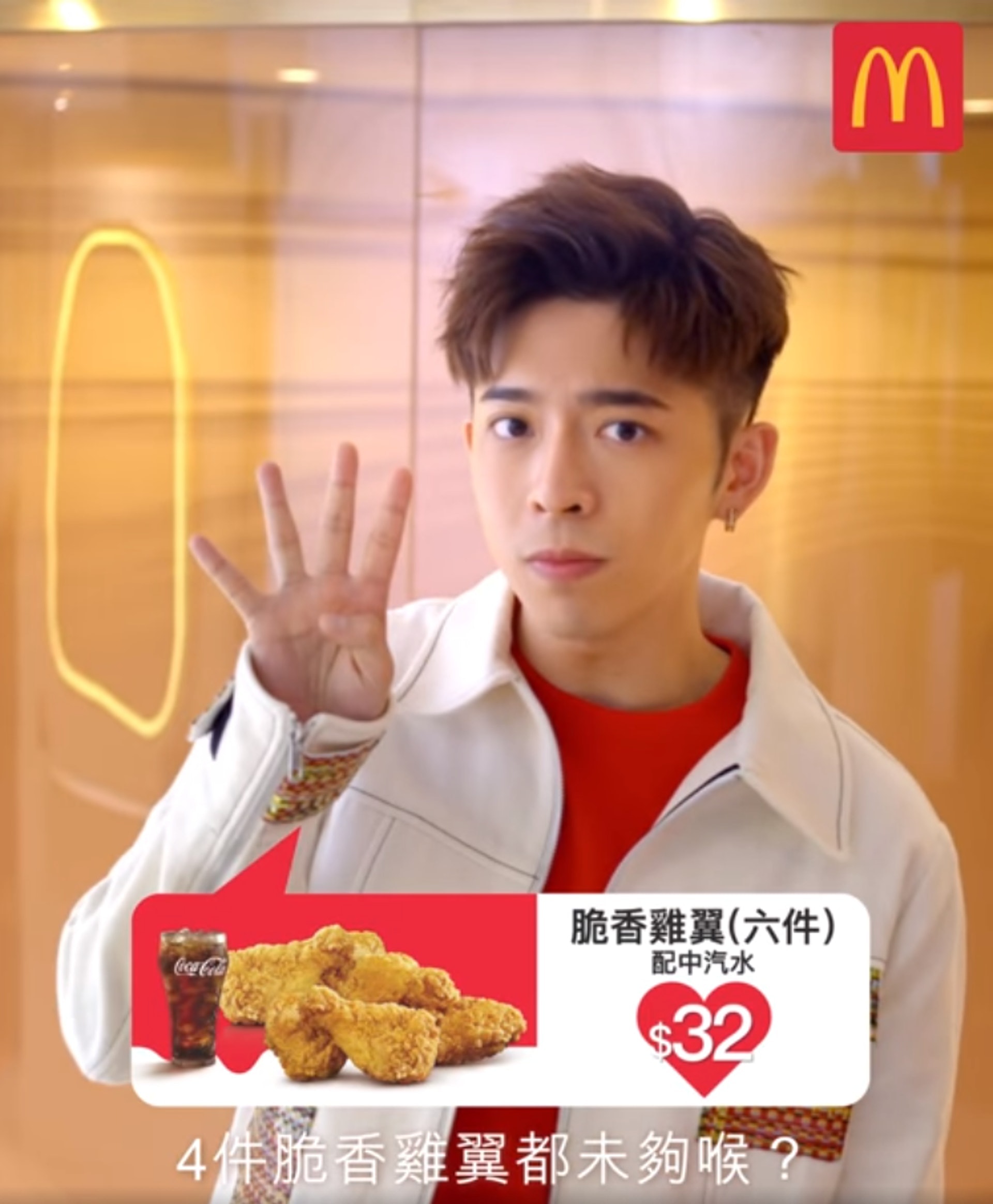 麥當勞早前以Mirror成員Edan拍攝的廣告影片宣傳脆香雞翼,惟其後雞翼一度暫停供應。(麥當勞fb影片截圖)