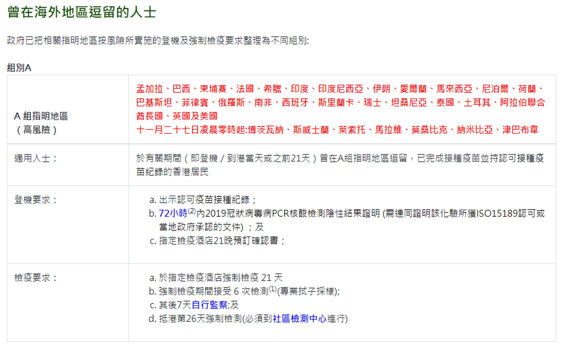 9 i" S/ F3 W: W5 C# n. |3 G政府同時指,為防患未然,將指明發現有Omicron輸入個案的地區為A組指明地區,包括澳洲、奧地利、比利時、加拿大、捷克共和國、丹麥、德國、以色列及意大利,相關指明周四(12月2日)凌晨零時生效。上述9個地區被納入A組指明地區後,於21天內曾逗留當地的非香港居民不會獲准入境。而香港居民則必須完成疫苗接種並持認可接種紀錄方可登機來港,並在抵港後於指定檢疫酒店接受21天強制檢疫,其間接受6次檢測,並須於抵港第26天到社區檢測中心接受強制檢測。 |