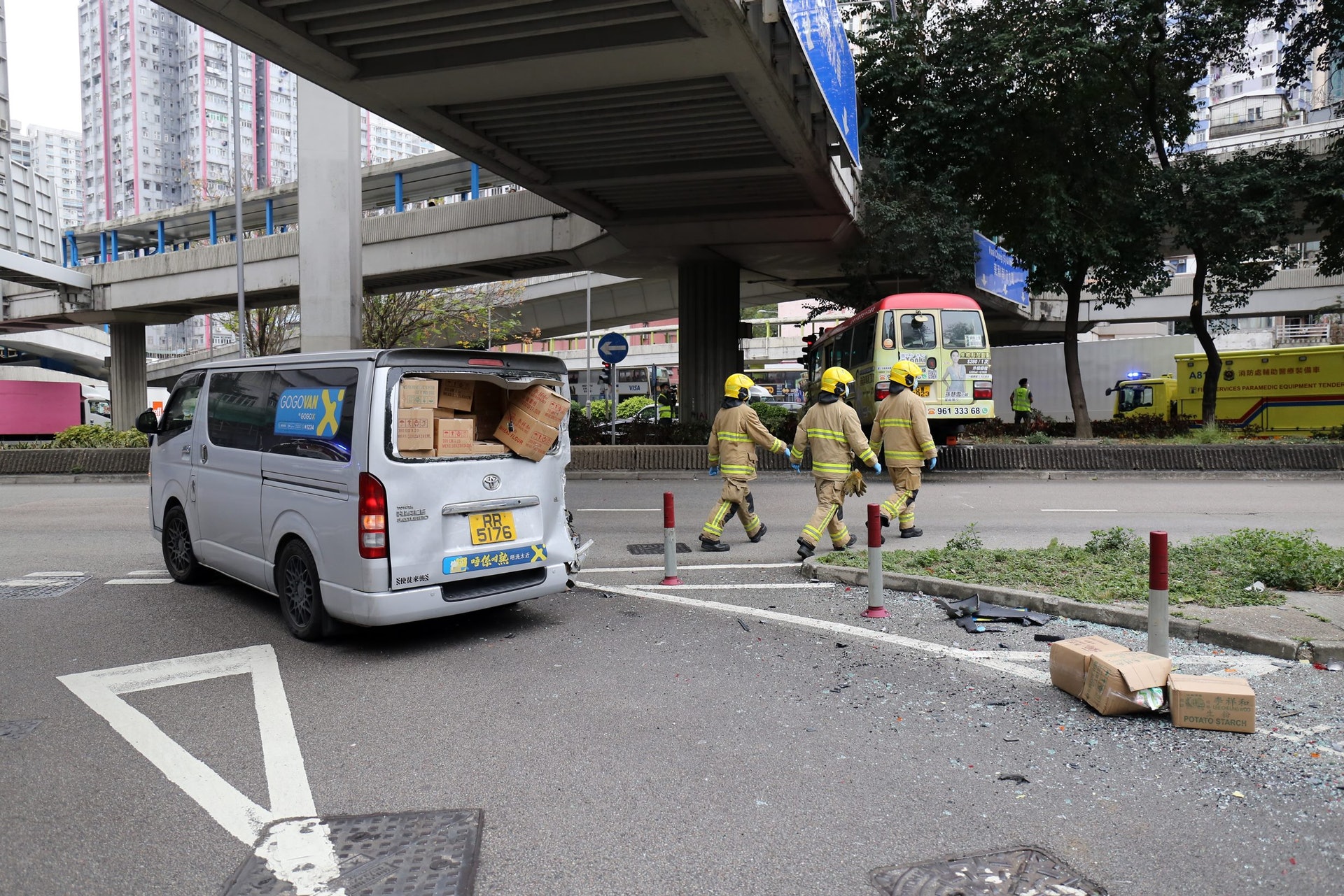 9 I9 n+ w4 t3 e9 H w0 S, y% o/ Y& [客貨車車尾玻璃窗爆裂,貨物飛出。(翁鈺輝攝)