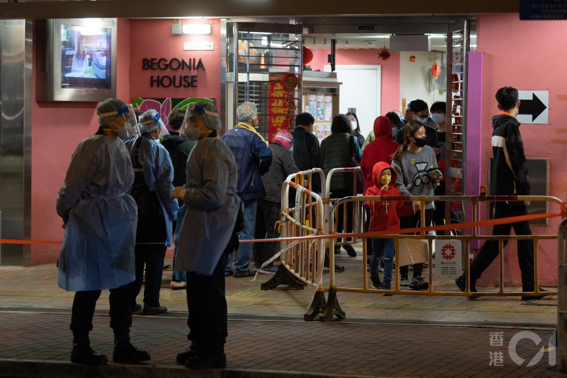 深水埗蘇屋邨海棠樓污水樣本對新冠病毒檢查呈陽性,懷疑在大廈內有隱形患者,大廈2月11日被圍封檢測。(廖雁雄攝)