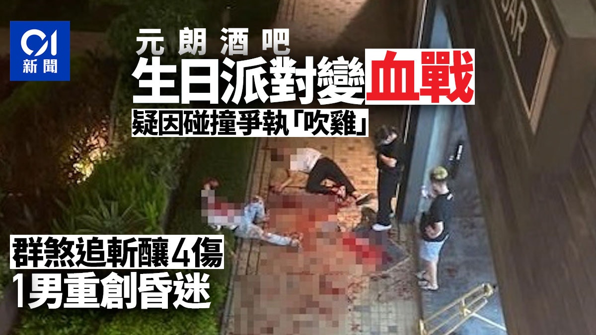 元朗發生斬人血案。今日(19日)凌晨零時許,警方接報指有10多名惡煞,在元朗安寧路38號屋苑「世宙」對開大混戰,當中有人持利刀作武器。救援人員接報趕抵,尋獲4名男傷者,當中1名37歲男子重創昏迷、1名31歲男子陷入半昏迷,立即由救護車送往屯門醫院搶救;另2人(27及41歲)則分別頭、手部受傷,幸仍清醒,被送往博愛醫院,事後2人均涉「在公眾地方打鬥」被捕。警方將案件列作「傷人」處理,元朗警區反三合會行動組正追緝10多名疑兇歸案。