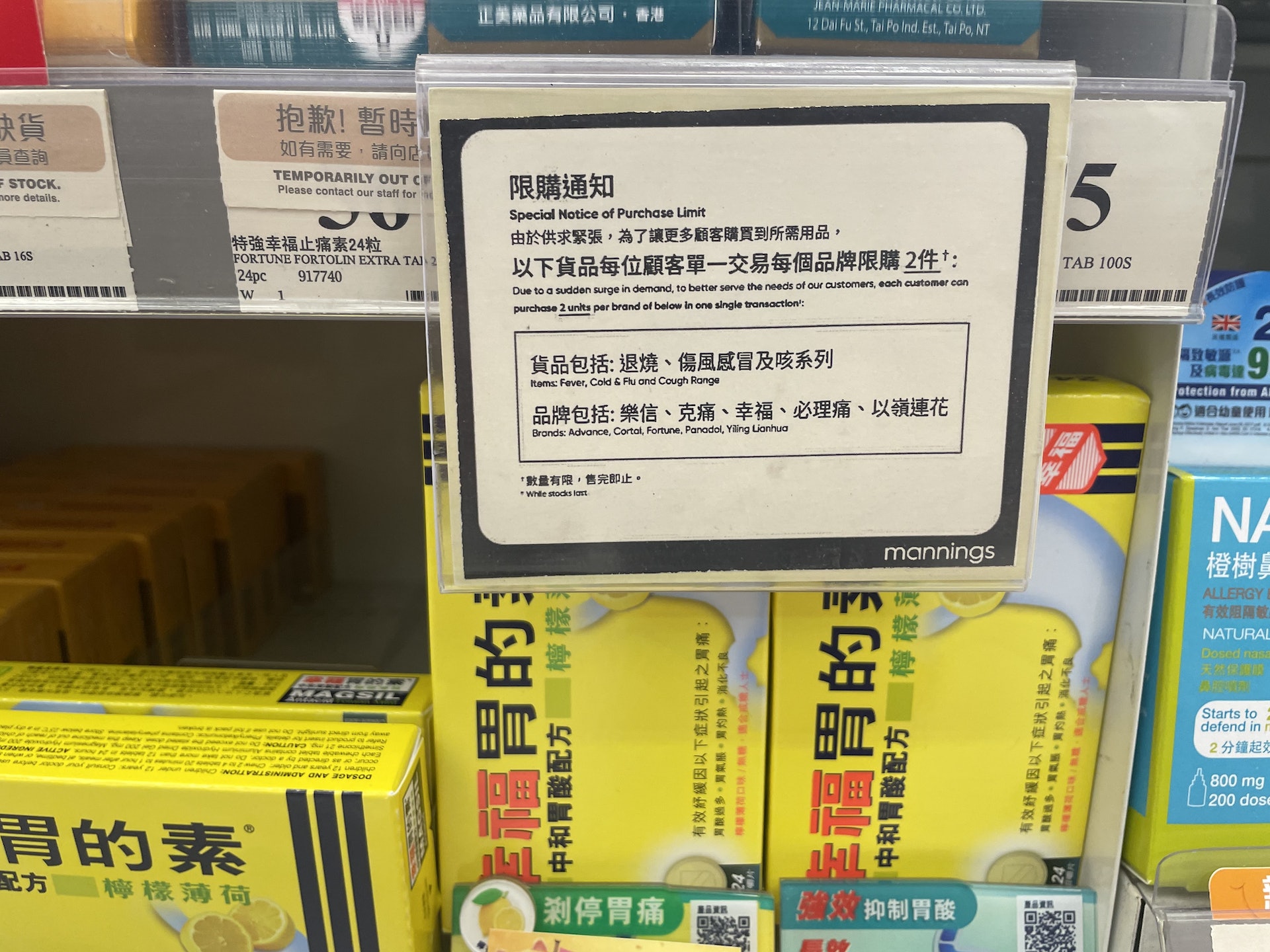 / g* m9 d- |3 M6 K8 R. _- a6 O) i公仔箱論壇記者下午巡視位於荃灣的數間藥房,店員均表示必理痛已售罄,亦不知道何時會再返貨。為防止市民搶購,連鎖藥妝店萬寧規定樂信、克痛、必理痛、幸福、以嶺、連花等品牌的退燒、傷風感冒及咳嗽系列,每人限購兩件;而屈臣氏也只限每人購買最多三件必理痛產品。