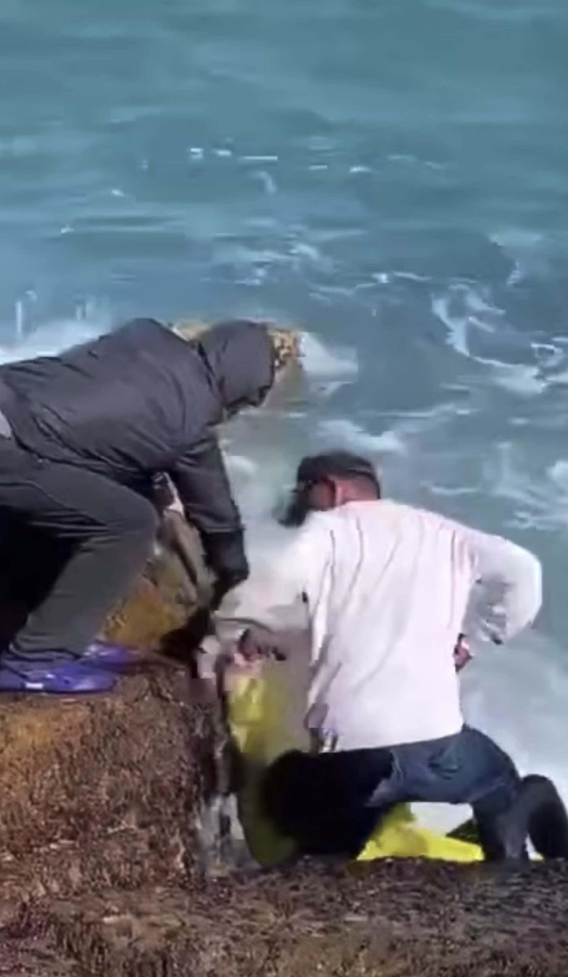 白衣男子用魚鈎將墮海女子拉回岸邊。(facebook「香港行山遠足之友(吹水山谷)」/網民Cyrus Chow片段截圖)- @( a/ `- N0 b7 u2 R1 n