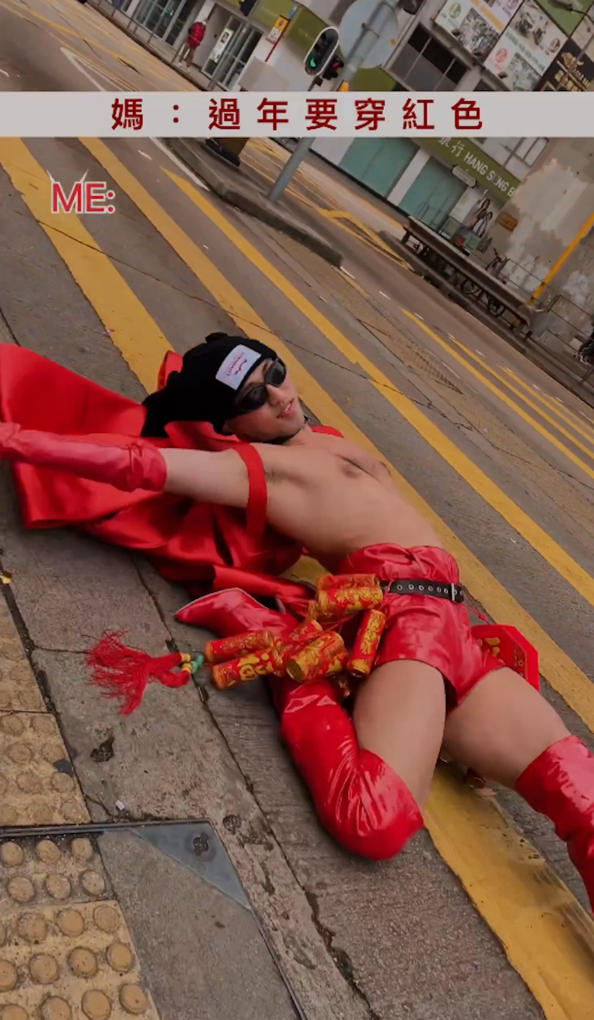 農曆大年初一穿得「紅噹噹」去拜年能增添節日氣氛,這男子一身像賀年禮盒般的打扮就更加突出了。兔年大年初一(1月22日),網上瘋傳有紅色「肉免男」出沒,只見1名身穿紅色短褲、紅色高跟長靴、背着紅色大蝴蝶結的赤膊男子,在太子港鐵站近旺角警署對開的行人過路線表演「行catwalk」,過馬路時熱舞瞓地,開心又忘我。不少網民笑說這名「肉兔男」是「新年最觸目打扮」、「呢啲咪Fashion囉,學嘢啦」、「 勁!真心勁!」,又指新年時遇上他一定十分開心。& R: i0 O6 |) L( u$ \