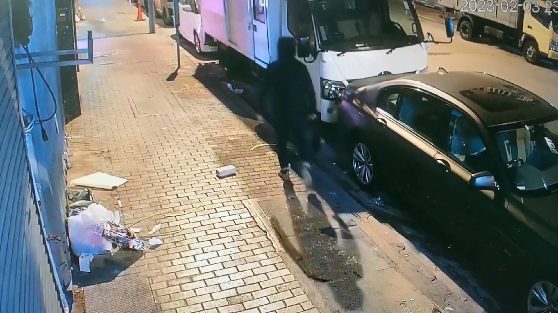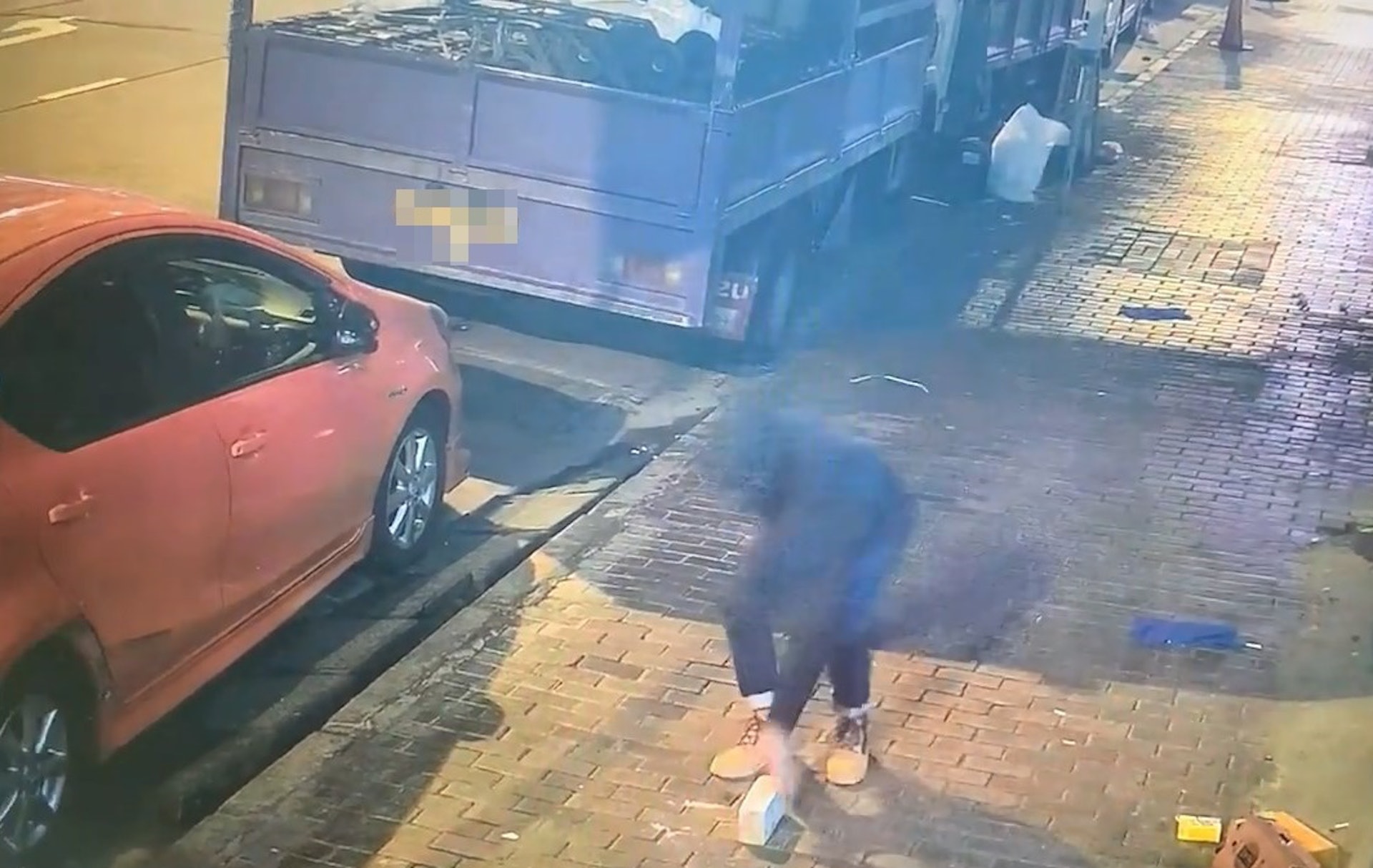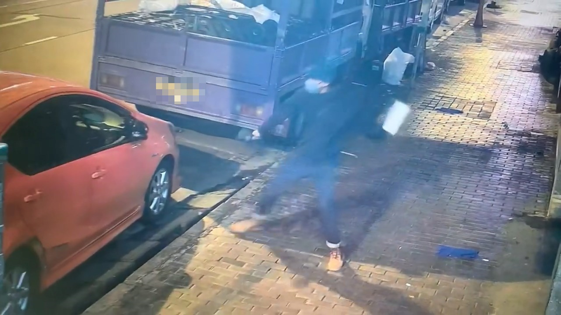 另一片段可見,該名男子同樣持磚猛擲一輛黑色私家車,但嘗試多次仍不成功。(網上影片截圖)