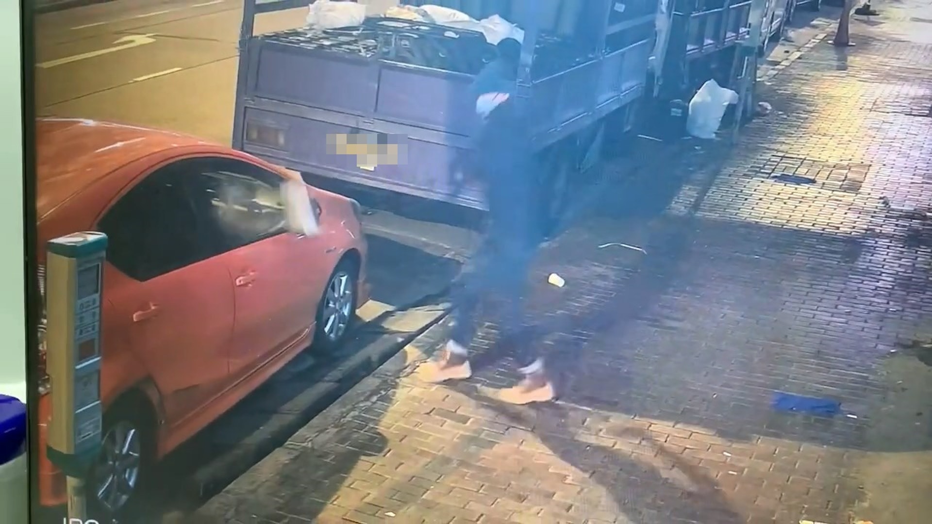 持有手提包、戴冷帽及口罩的男子,手持磚頭走向一輛停泊於咪錶位的橙色私家車。(網上影片截圖)公仔箱論壇$ D2 { J6 a& @% l* i, _# q" V