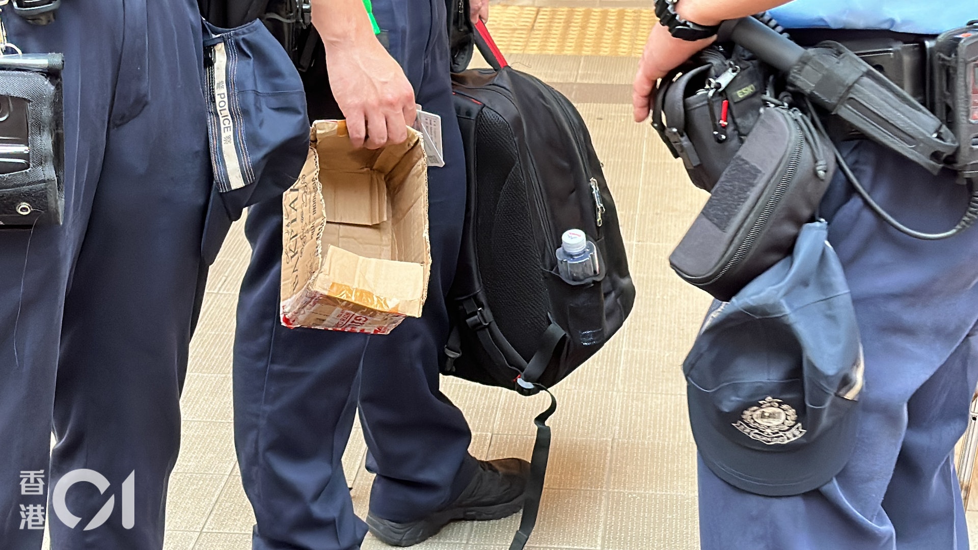 % L' q G% h3 r+ \4 f下午5時許,有市民不堪賣唱男女帶來噪音滋擾,報警求助,警員到場調查,並檢走涉案男女的錢箱。(香港01記者攝)