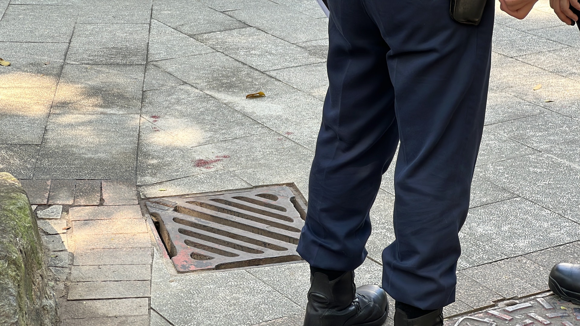 ( I- V9 E* G2 V: F* R' M公仔箱論壇持刀漢犯案後於坑渠棄刀,期間傷及自己遺下大量血迹,在屋苑停車場外自行包紮之際被應召到場的警員制服。(翁鈺輝攝)tvb now,tvbnow,bttvb: e$ Z0 A; i, J+ D# c3 u8 b( u