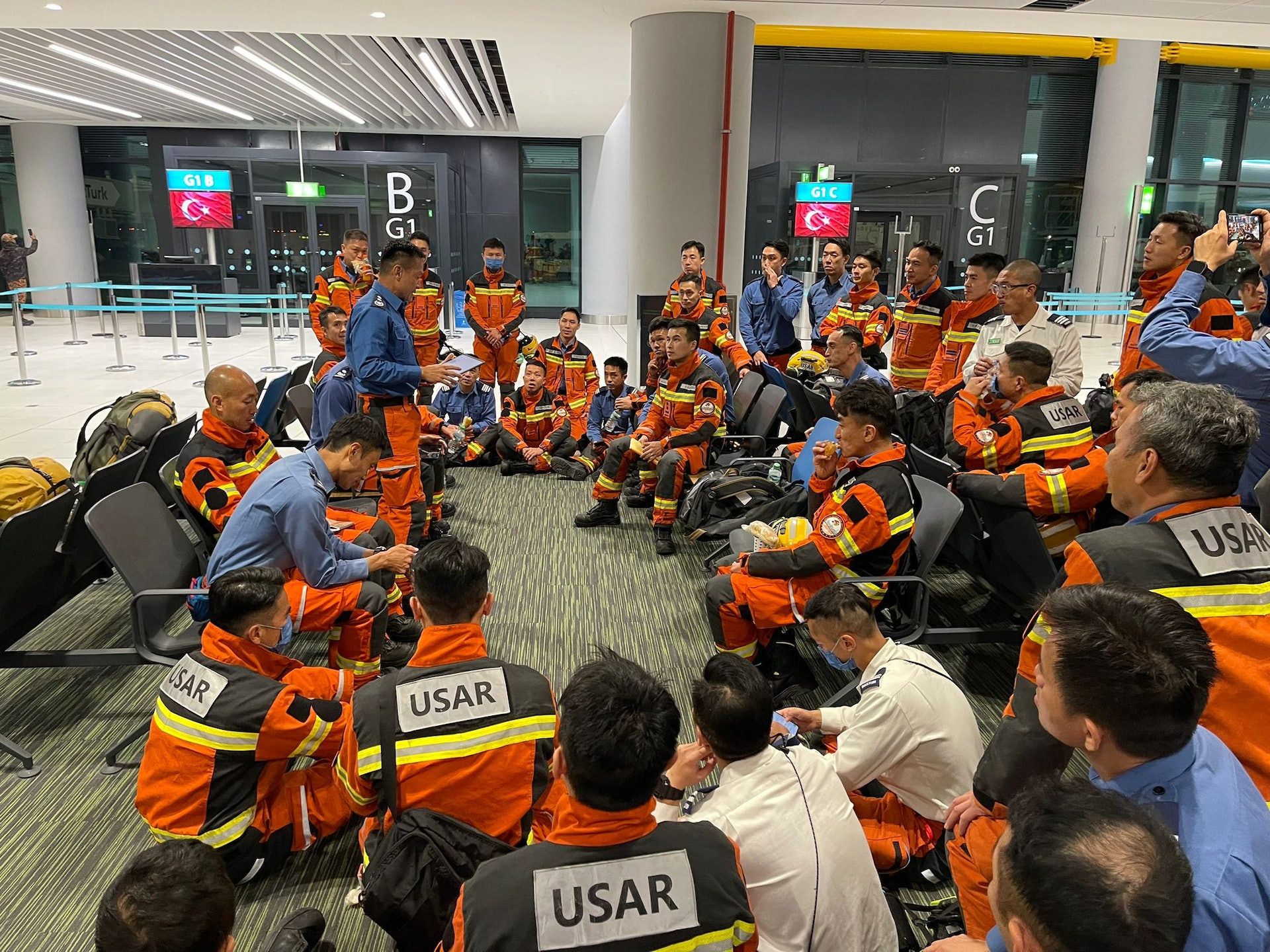香港60人搜救隊土耳其當地時間2月9日16:00抵達土耳其伊斯坦布爾機場,轉機期間集合匯報,即將前往阿達納災區協助救援。(保安局Facebook圖片)