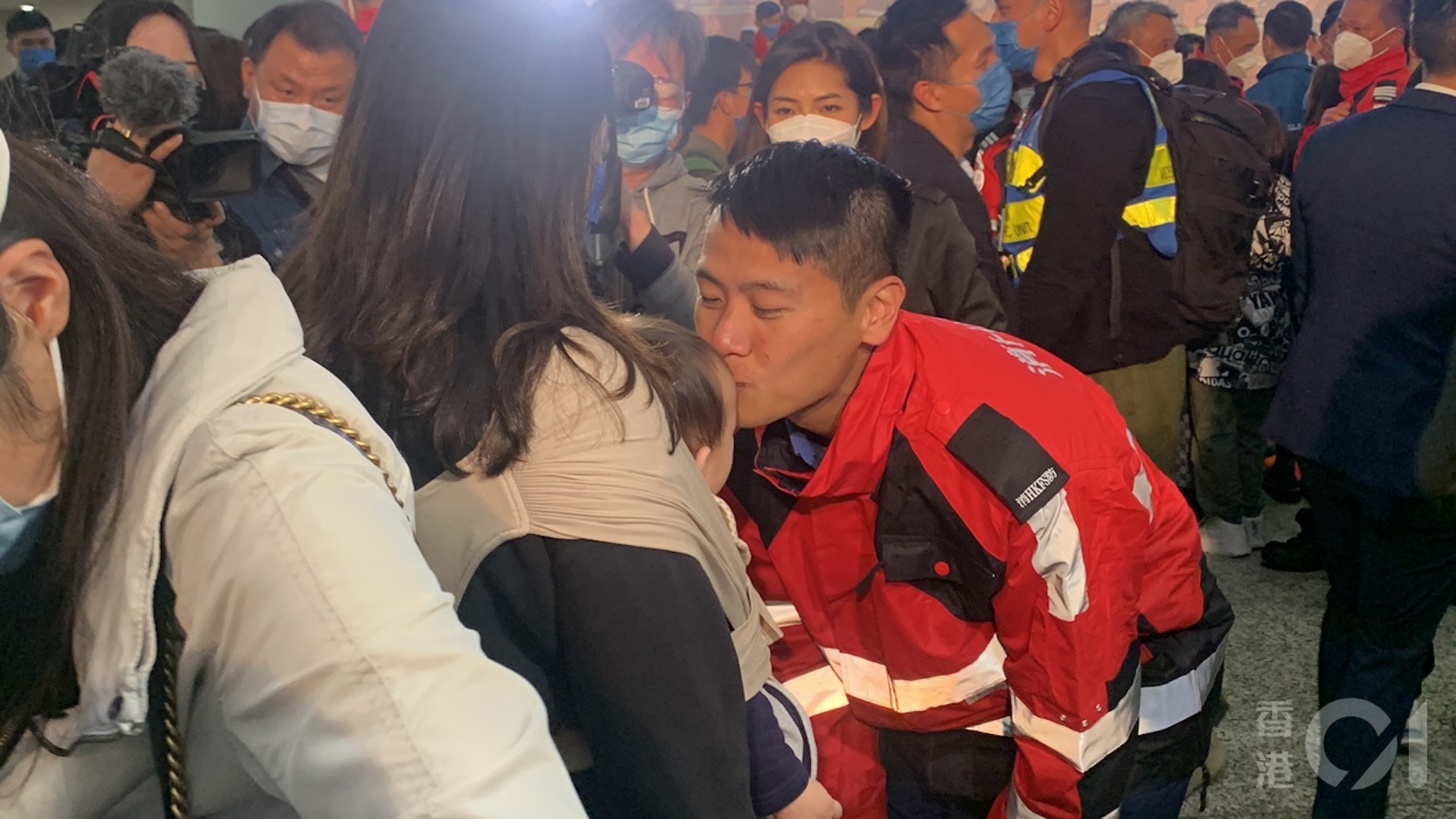 土耳其上周一(6日)發生7.8級強烈地震,港府派出的59人救援隊周五(17日)深夜返抵香港。救援隊隊員之一的消防員文發,看到8天無見的太太和10個月大的兒子來接機,忍不着掉男兒淚,連忙親吻兒子。他表示,在當地睡眠「瞓得唔好」,回家後第一件事想沖涼和睡個好覺。