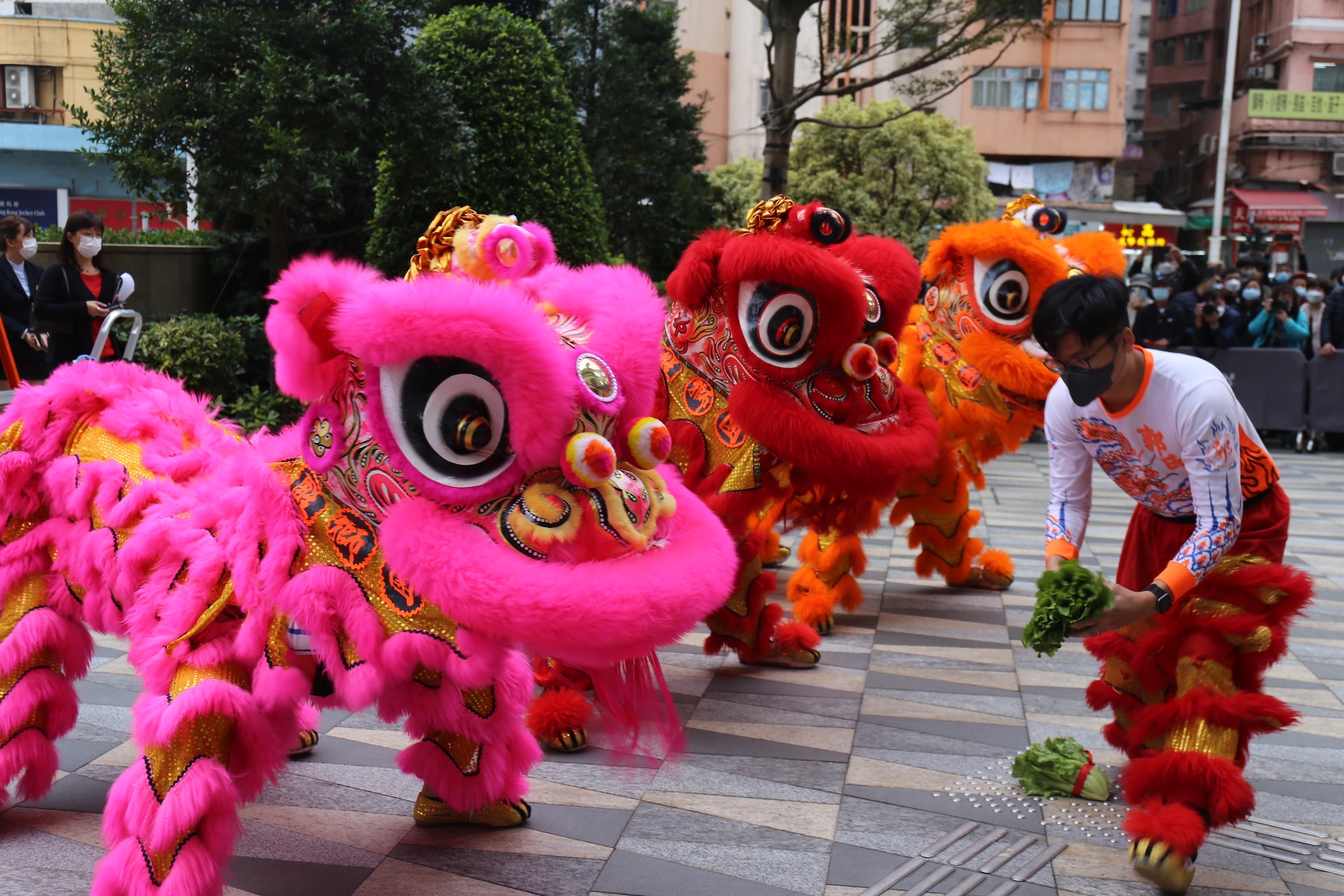 4 u5 \, X" d% \三頭醒獅元宵當日於觀塘裕民坊商場演出及巡遊,團員將生菜放於地上,讓醒獅「咬青」,象徵五穀豐收。(鄭嘉惠攝)