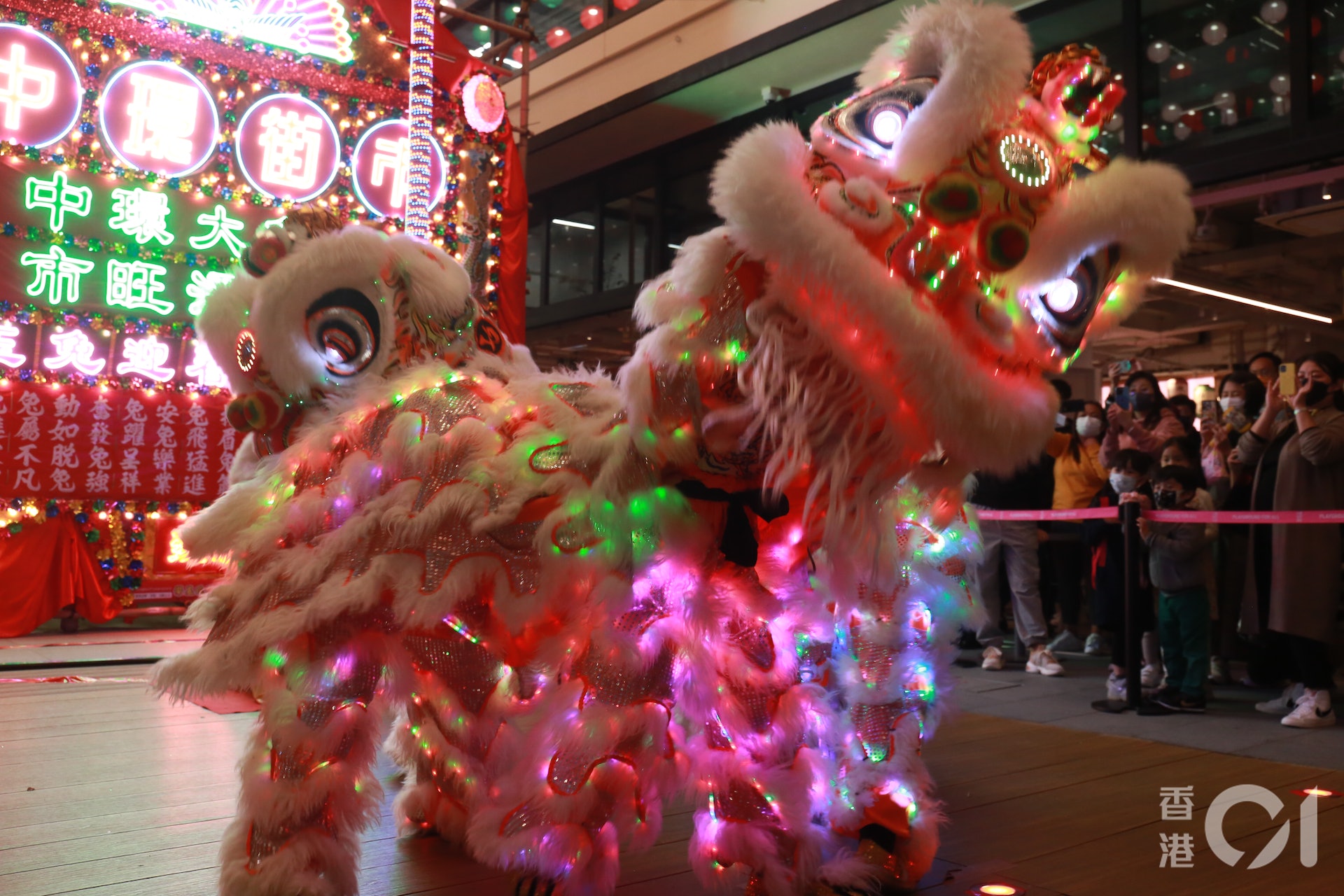 郭氏的舞獅隊於中環街市表演。創新獅子的顏色造型,看起來色彩繽紛、毛絨絨,惹人喜愛,更糅合多媒體等元素進行表演,例如「LED獅」,洗脫傳統文化昔日的刻板印象,煥然一新。(林振華攝)
