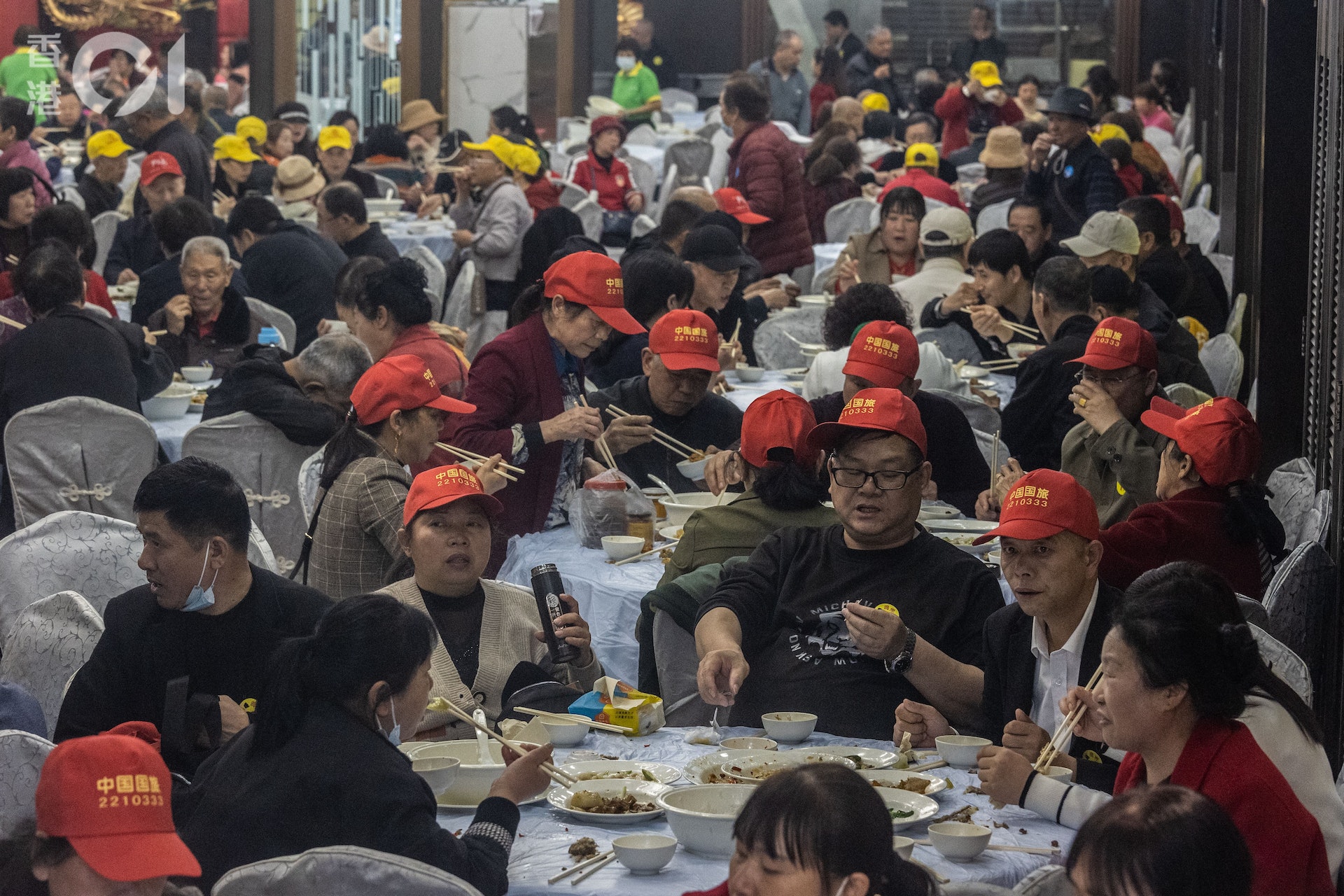 《香港01》記者今日(8日)中午到位於土瓜灣崇安街的「嘉樂軒」酒樓,發現來用膳的旅行團排隊人龍已消失,有約數十名團友用膳後在地下,但聚集人流明顯大減。(黃寶瑩攝)