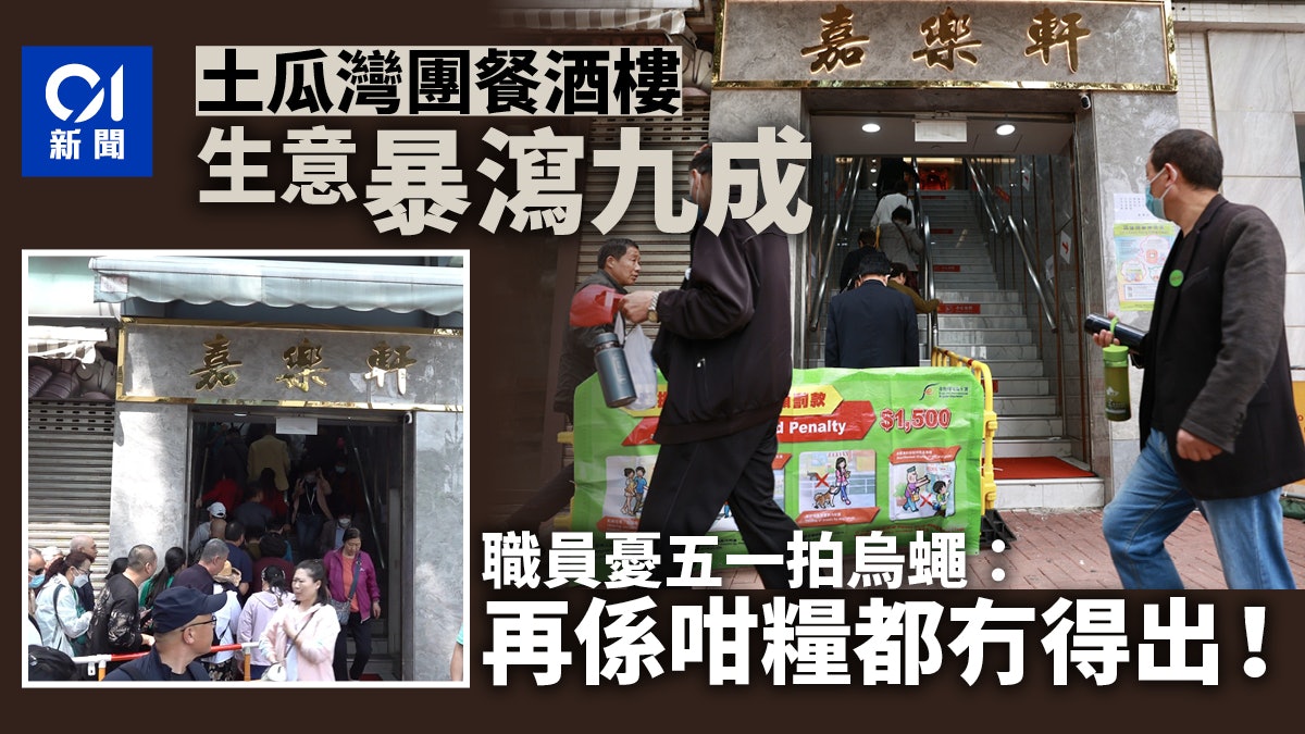 1 N* ~) T. ~9 I1 G/ T7 t7 M《香港01》記者今日(8日)中午到位於土瓜灣崇安街的「嘉樂軒」酒樓,發現來用膳的旅行團數目明顯大減,排隊人龍已消失,有約數十名團友用膳後在地下聚集,等候離開。(黃寶瑩攝)os.tvboxnow.com0 F# o* w, q0 x- D" [2 T% |