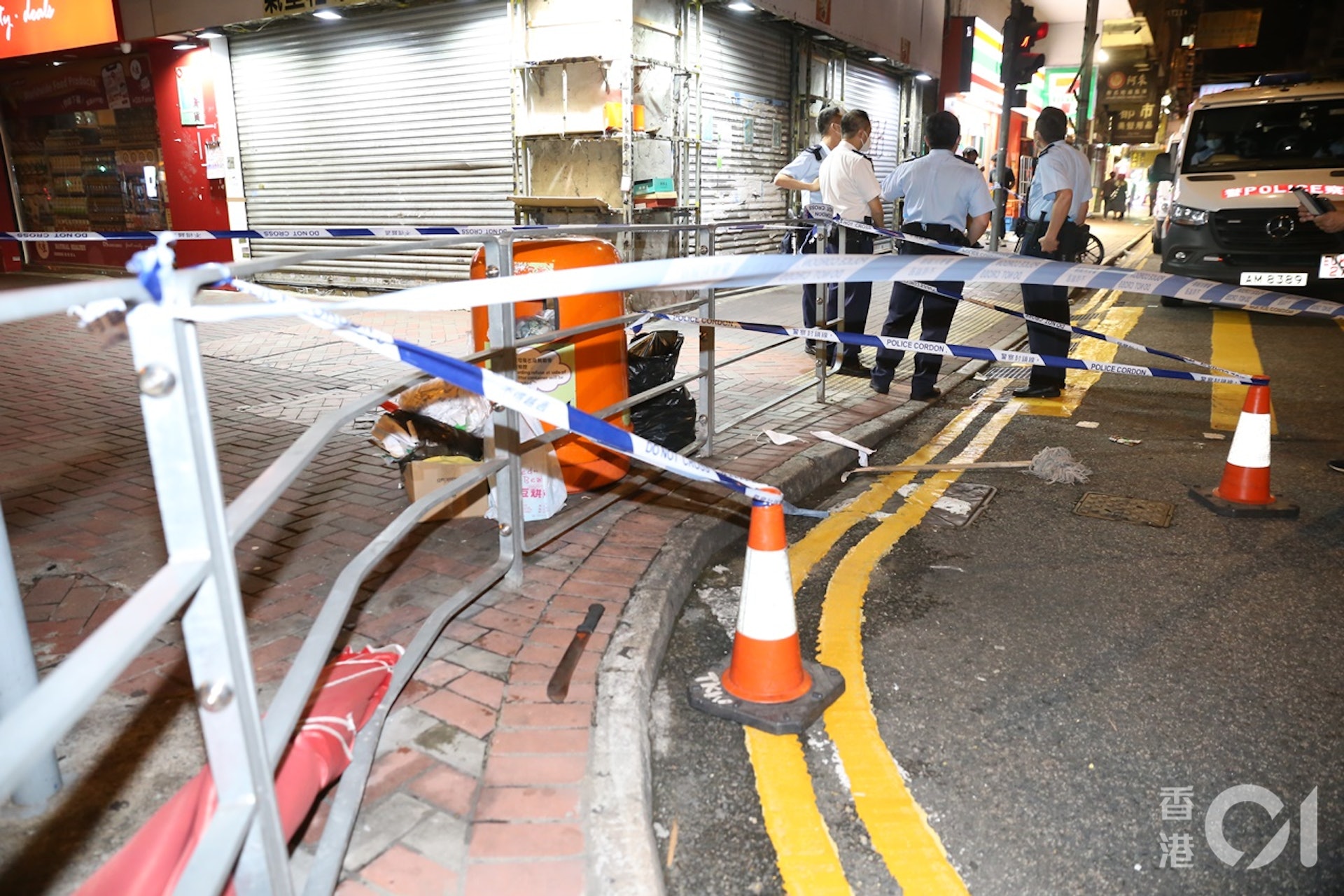 現場遺下一把利刀、紙刀套及斷裂地拖等武器。(陳永武攝)" T* g# F' z6 @6 f# q