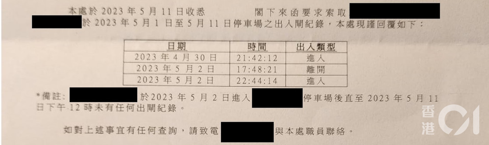 黃先生提供的屋苑停車場回覆,顯示其車輛於事發時沒有離開停車場。(受訪者提供)( _7 ~8 b. ?% c