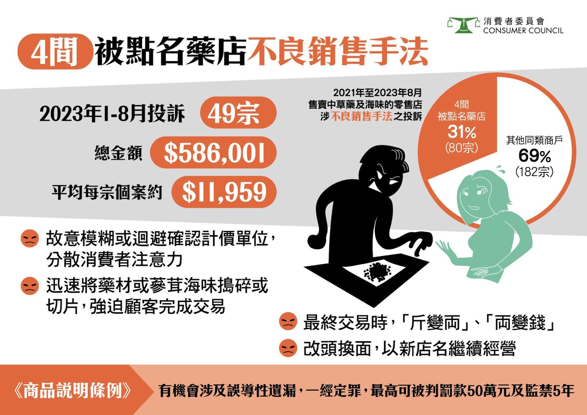 # `" v$ Z* v3 F6 _) ~* i/ S消委會周四(9月7日)召開記者會,點名譴責銅鑼灣的四間藥店涉嫌不良營銷。這些藥店收到大量投訴,大部份投訴涉「斤變両」、「両變錢」,令顧客最後要付較原先理解貴10倍的、甚至16倍的價錢。當顧客有購買意欲,店員亦會迅速將藥材或蔘茸海味切片,藉以強迫顧客完成交易。