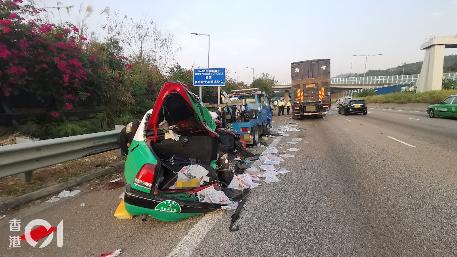 涉事的士嚴重毀爛。(馬路的事 (即時交通資訊台)facebook/網民Yau Lau片段截圖)+ N% o$ V8 U4 ]; _3 Z0 E6 ]. c