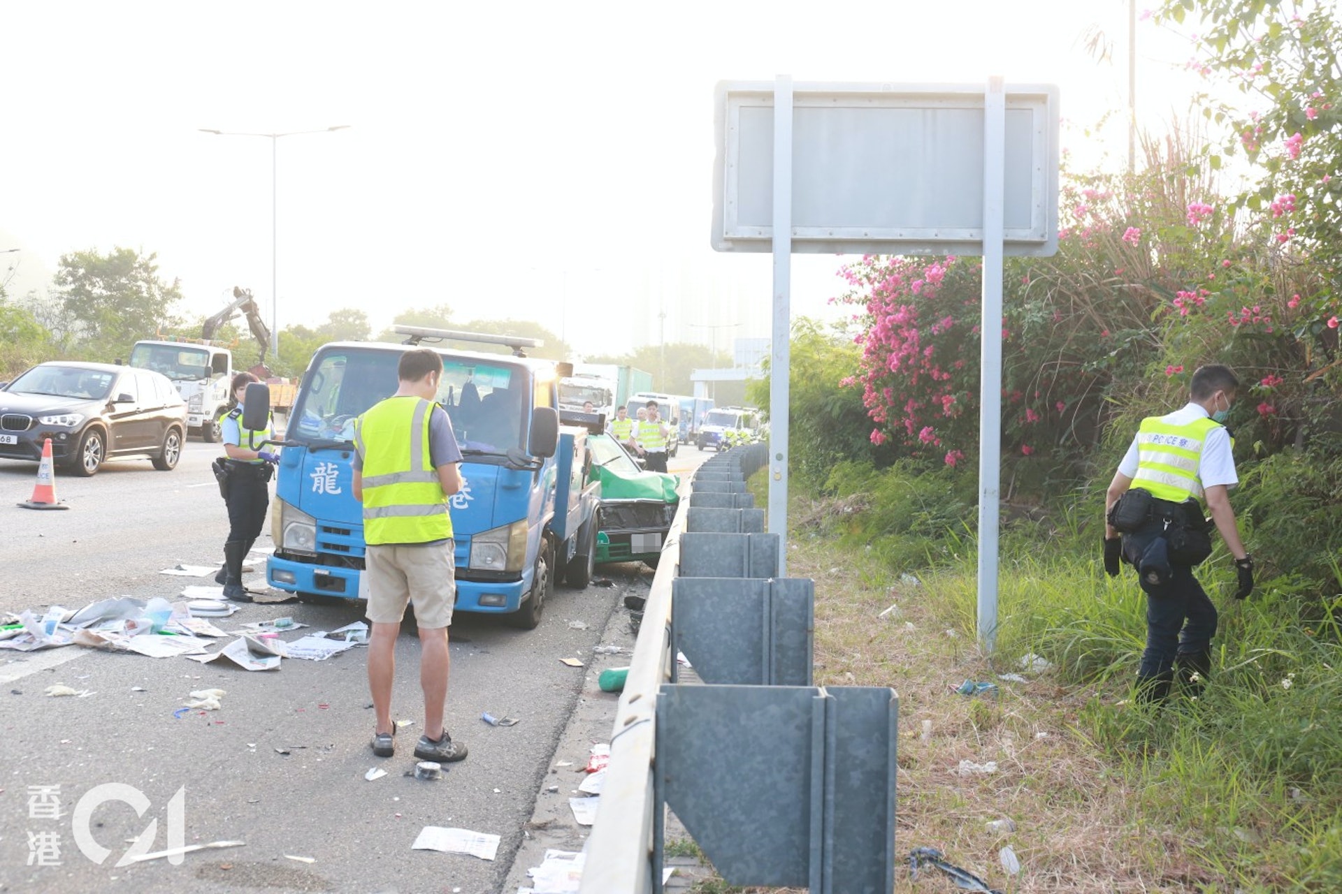 - m N+ Y. i& o( [2 G5 h* Q7 Z元朗公路一輛的士停在路肩換胎期間,一輛貨車收掣不及猛撼的士,將的士推至撞上前方另一輛拖車,的士嚴重損毀,現場遺下大堆雜物。(林振華攝)TVBNOW 含有熱門話題,最新最快電視,軟體,遊戲,電影,動漫及日常生活及興趣交流等資訊。( {, e; v2 `* T: V- c5 C2 p