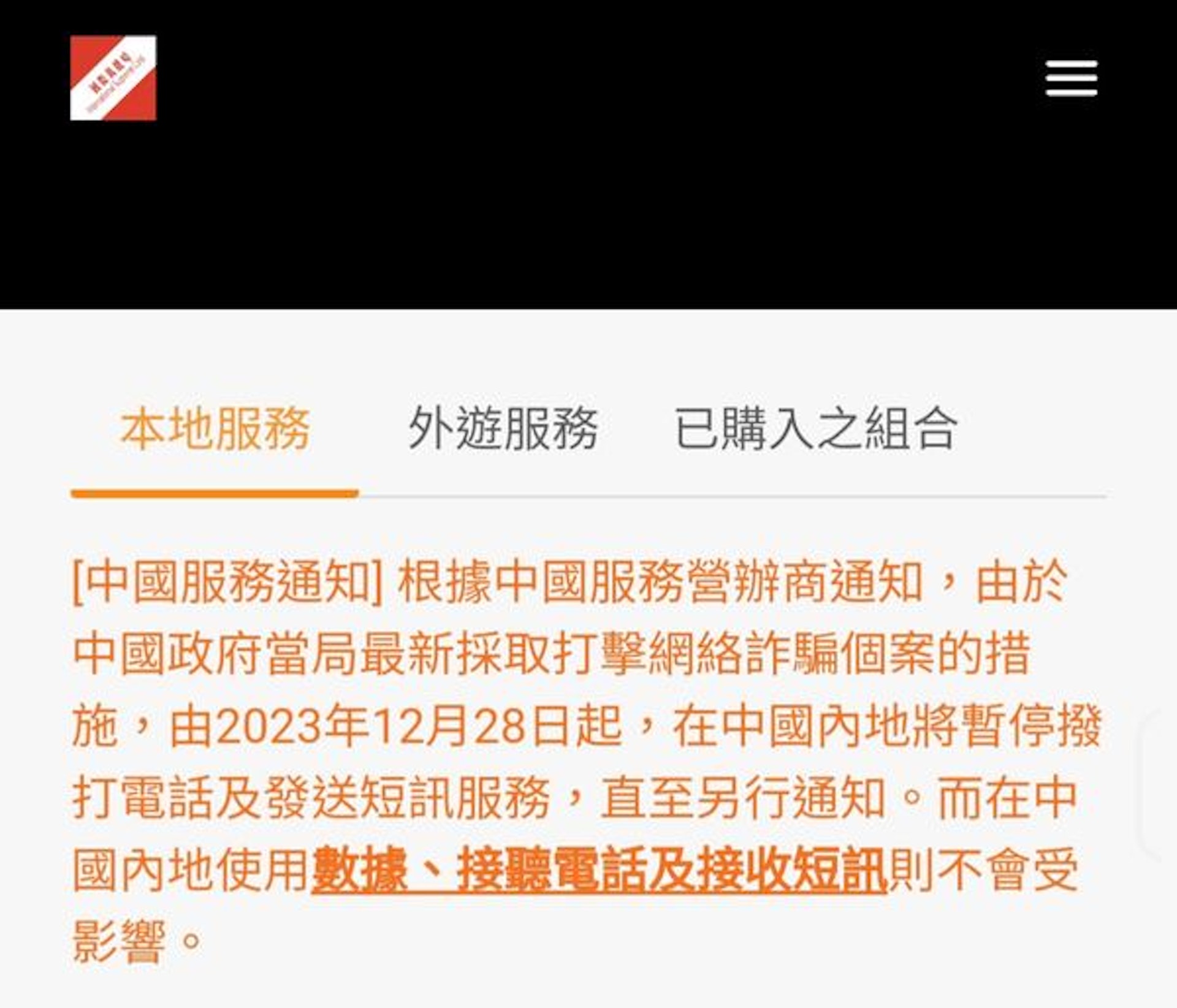 : B4 s1 p4 C" P6 L/ _( s公仔箱論壇一間專售數據卡的商戶於網上平台,引述3國際萬能卡的通知表示,根據中國服務營辦商通知,由於中國政府當局最新採取打擊網絡詐騙個案的措施,由本周四(28日)起,內地將暫停撥打電話及發送短訊的服務,直至另行通知;而在內地使用數據、接聽電話及接收短訊則不受影響。, S* M9 M9 m1 L5 O! e