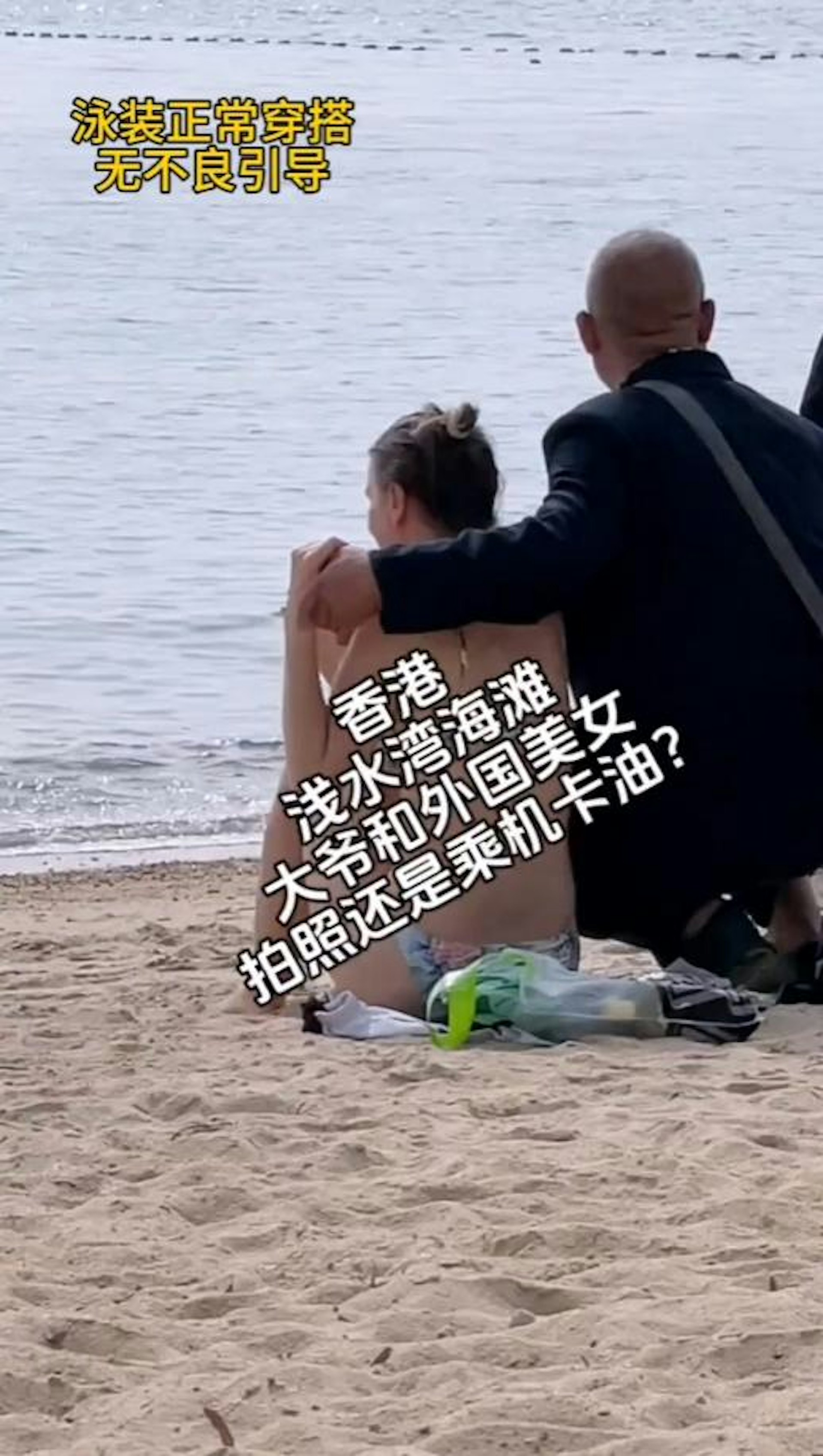 * a' D7 \' j X( V4 L2 z6 I5 Y影片畫面有文字寫着「香港淺水灣海灘大爺和外國美女拍照還是乘機卡油」,意指有大叔與洋女合照時乘機抽水。(抖音影片截圖)! V9 B( H0 U0 D6 E% [) ?7 e