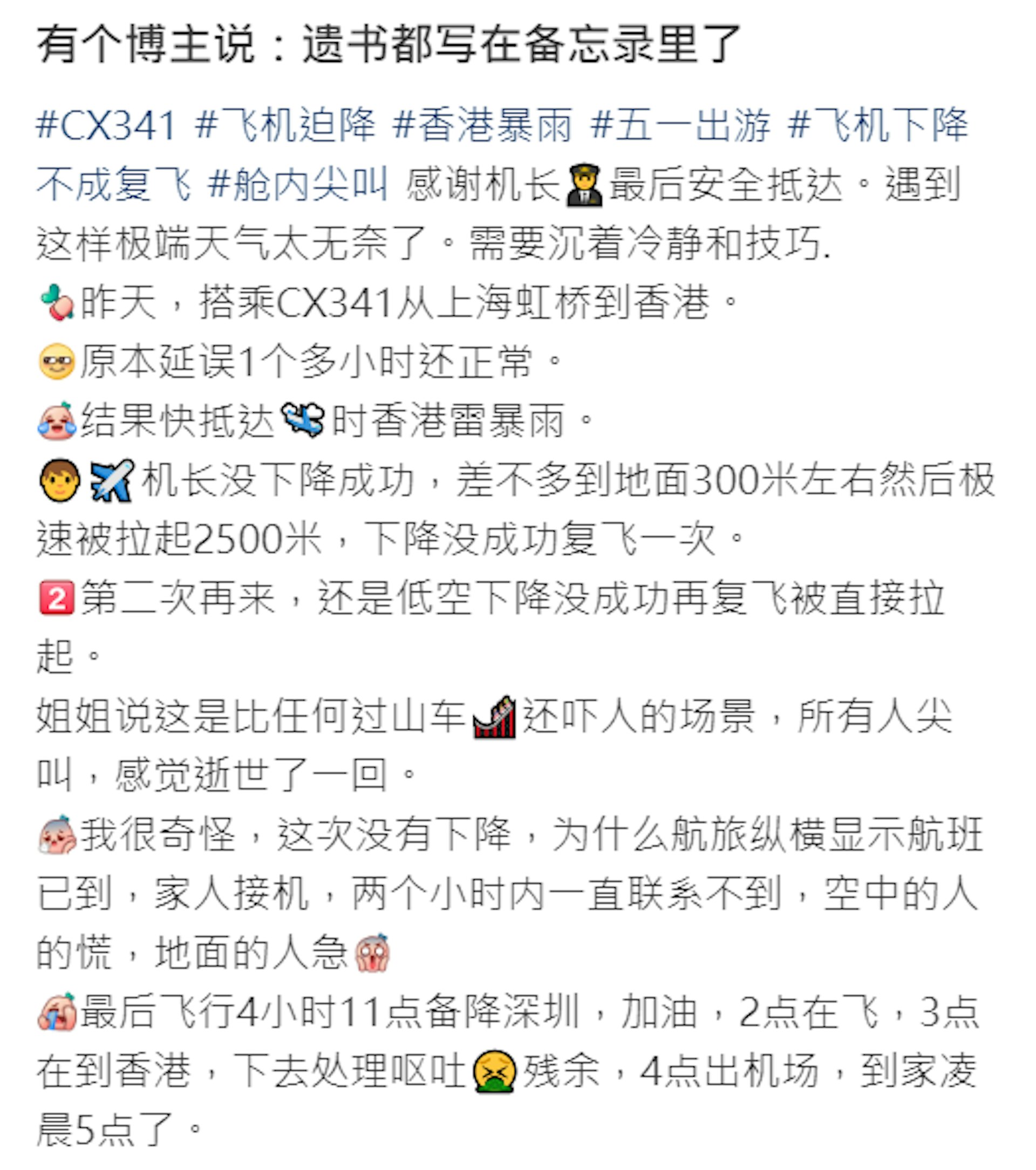 多名內地乘客在社交平台「小紅書」分享空中驚魂,有人指當時顛簸非常,「屁股離開座位起碼三四次」,機上小朋友狂哭、嘔吐聲此起彼伏、物品散落一地,甚至「空姐都哭了」,形容機上乘客都是生死之交;另有乘客更指當時已在手機寫好遺書,「離死亡最近的一次」。