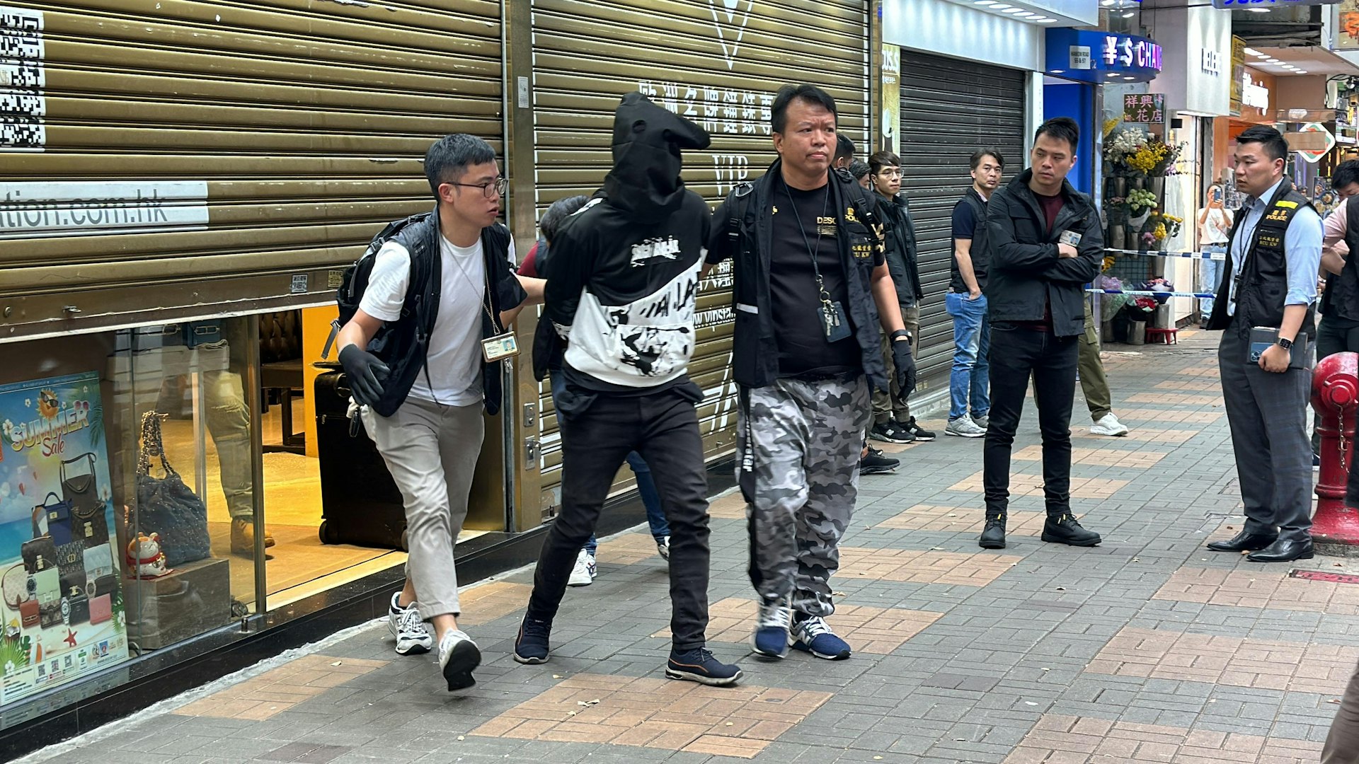 尖沙咀海防道近漢口道鐘錶珠寶店「名人站」今午(7日)遇劫,幸警方早已接報埋伏,將5名非華裔男疑犯一網成擒。案發一刻的閉路電視片段曝光,可見5名蒙面匪徒乘私家車抵達店外海防道,浩浩蕩蕩持刀及大鎚闖入店內,有職員驚慌走避。匪徒以刀鎚指嚇店員,狂扑玻璃飾櫃約20秒後,即有便衣警員擎槍趕抵,匪徒隨即丟下武器,束手就擒,有人被撳於地上,其間未見反抗。