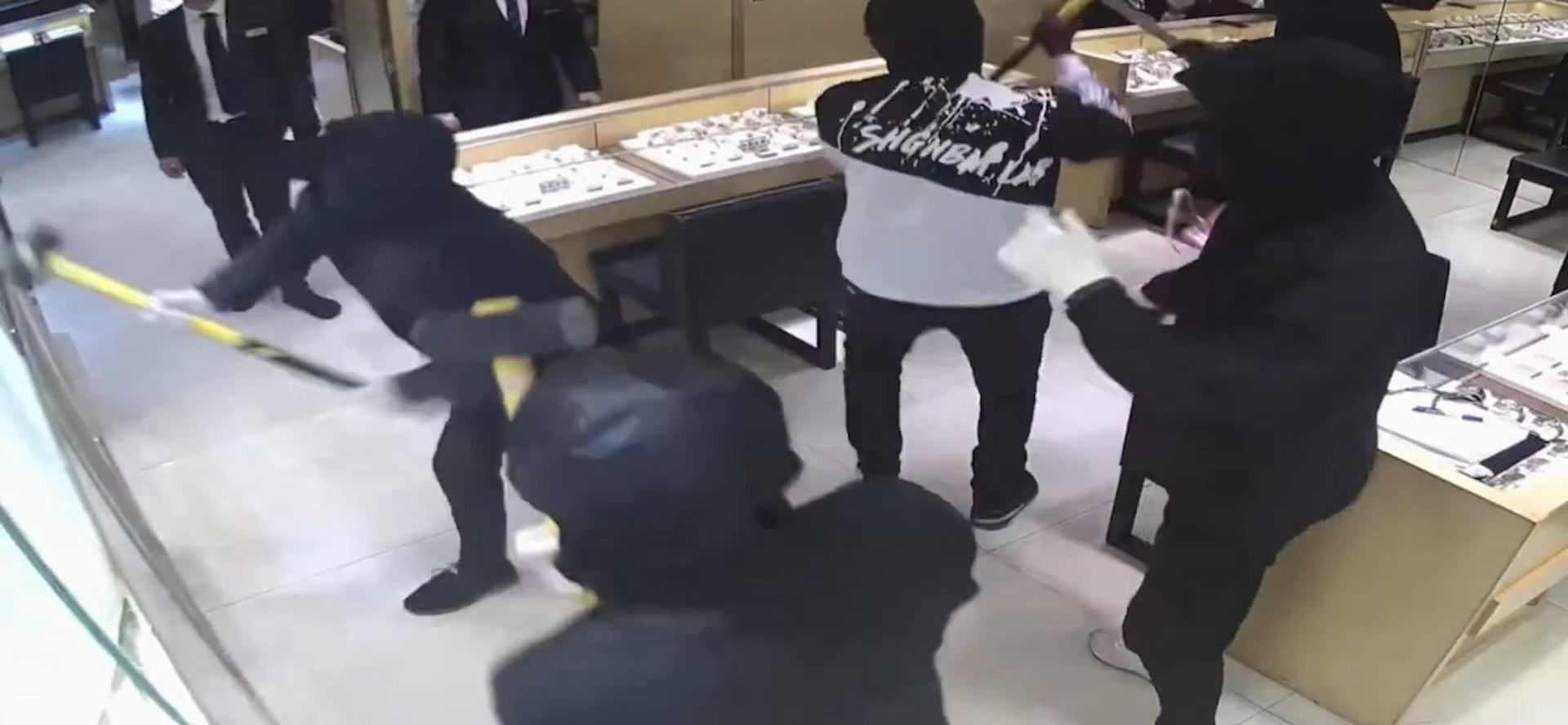 匪徒用大鎚狂扑玻璃櫃及飾櫃。(名人鐘錶珠寶閉路電視片段截圖)