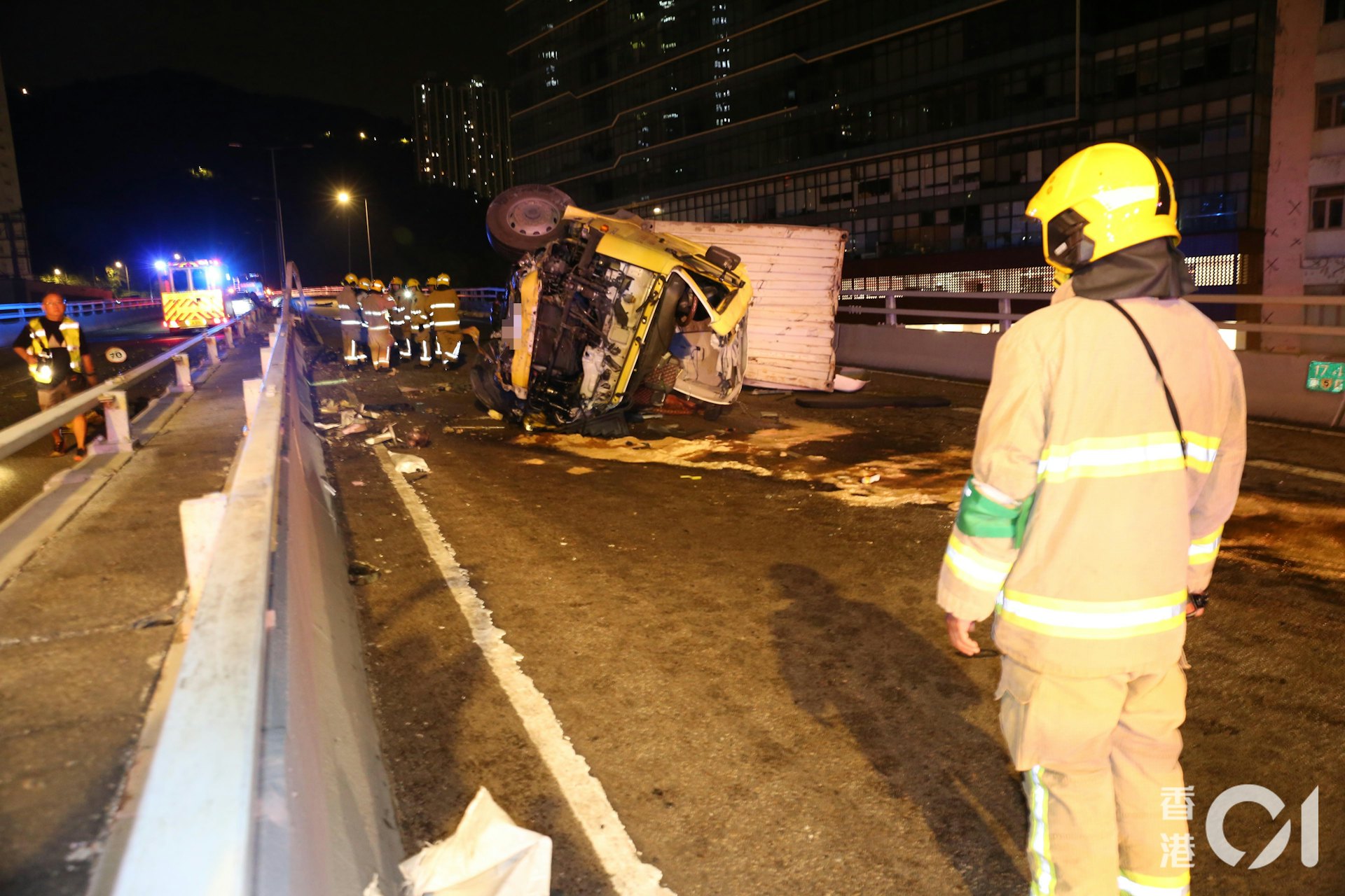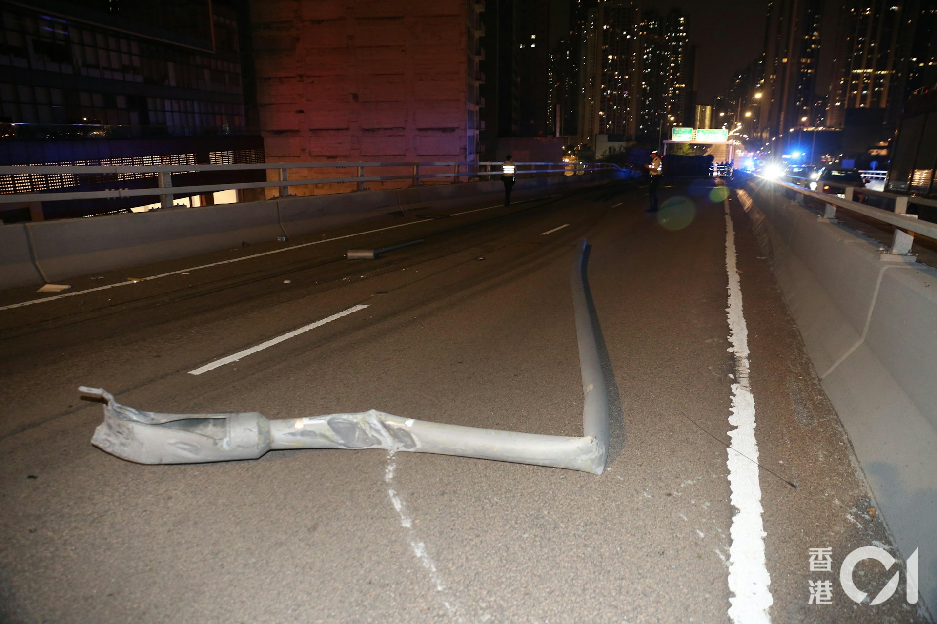 8 a! j0 f1 H1 v K. s0 @4 W現場可見,橋面和橋下一片狼藉,包括荃灣路兩邊行車線,多支燈柱被掃毀,部份燈柱橫亘橋面路中,貨櫃車車頭連同駕駛室嚴重損毀,貨櫃尾部被劏開,擱在天橋欄杆上,貨櫃車零件和大批尿片散落一地,石壆遭到撞毀,碎石四散一地。
