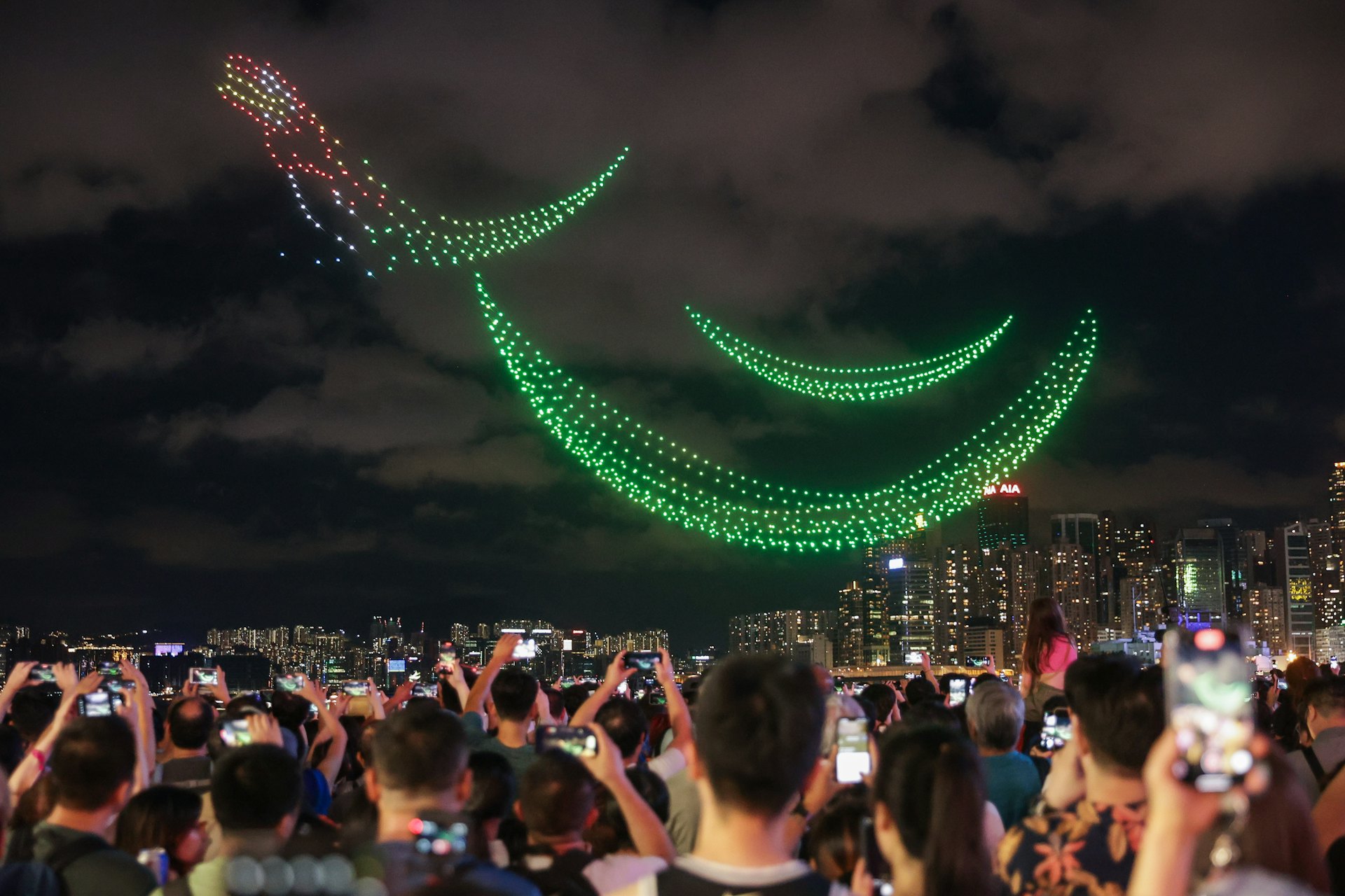 + f A7 h6 @+ y1 S4 Z旅發局今晚(10日)8時於灣仔海濱對出海面舉行端午節慶主題無人機表演。無人機切出的鯨魚圖案散開變回三片竹葉。(蘇煒然攝)