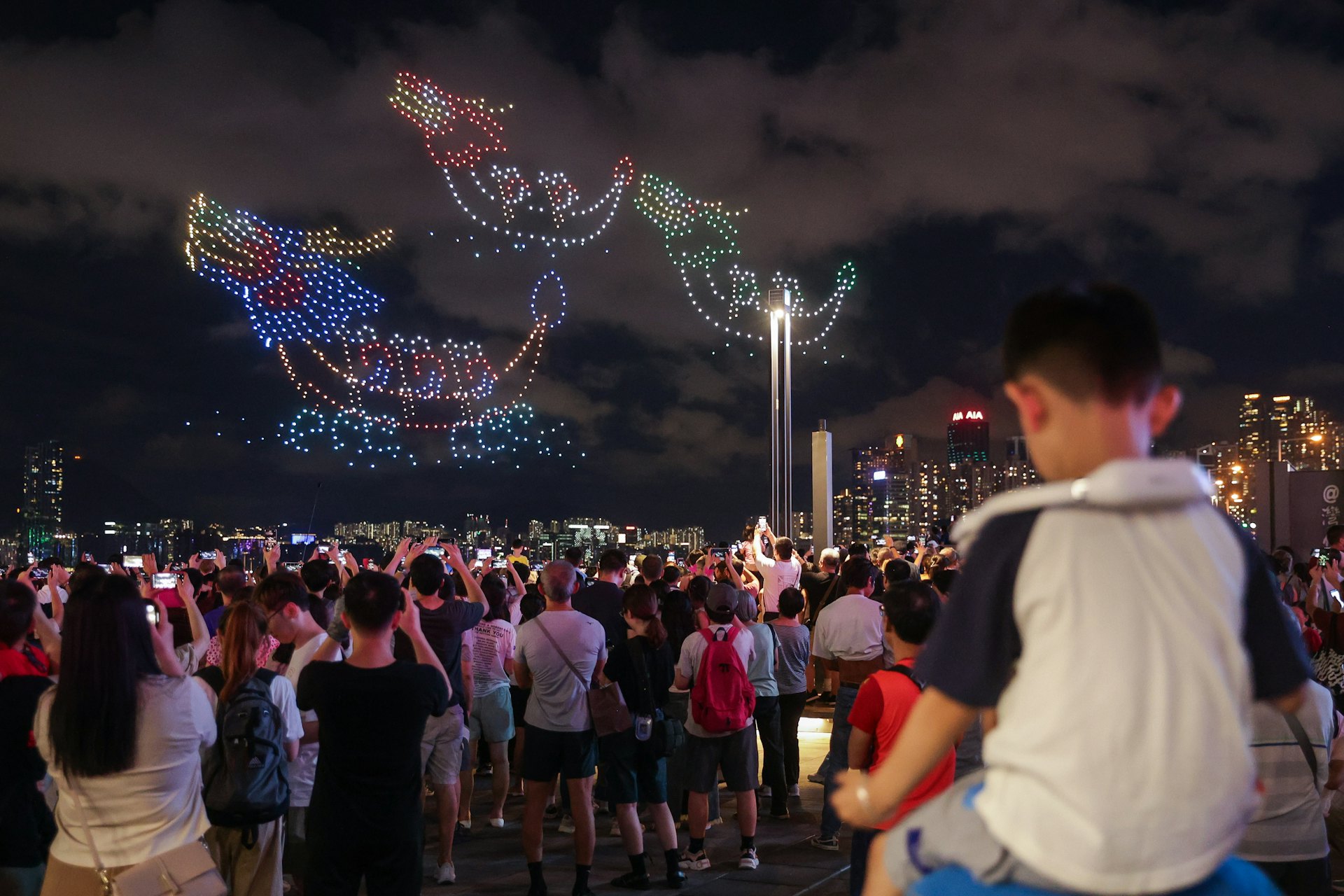 & |4 Z6 M3 f& D9 U公仔箱論壇無人機表演從昨晚8點開始,全程歷時10分鐘。旅發局推薦的位置在灣仔「HarbourChill海濱休閒站」及「水上運動及康樂主題區」。旅發局表示,因視角受阻,灣仔海濱場地部分位置未能清晰觀賞無人機表演,九龍沿岸亦未能觀賞是次表演。