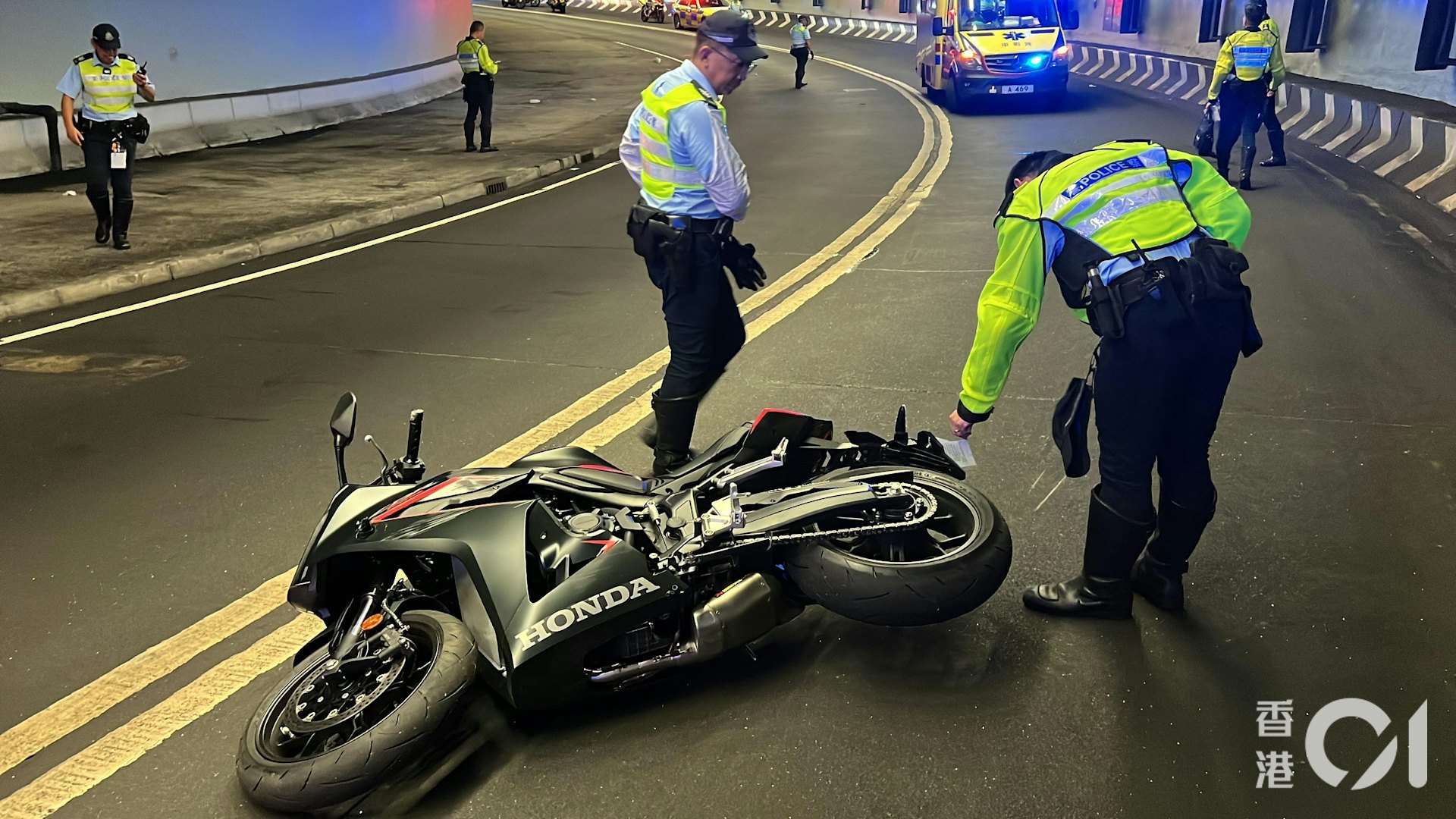 5 I" f* l( y' ]- { n5 ] }% q公仔箱論壇本田電單車沿尖沙咀連翔道地下行車道往西隧方向行駛,落斜駛至一個右彎時懷疑失控「自炒」。(李家傑攝)公仔箱論壇/ {& [6 m& P9 C6 X
