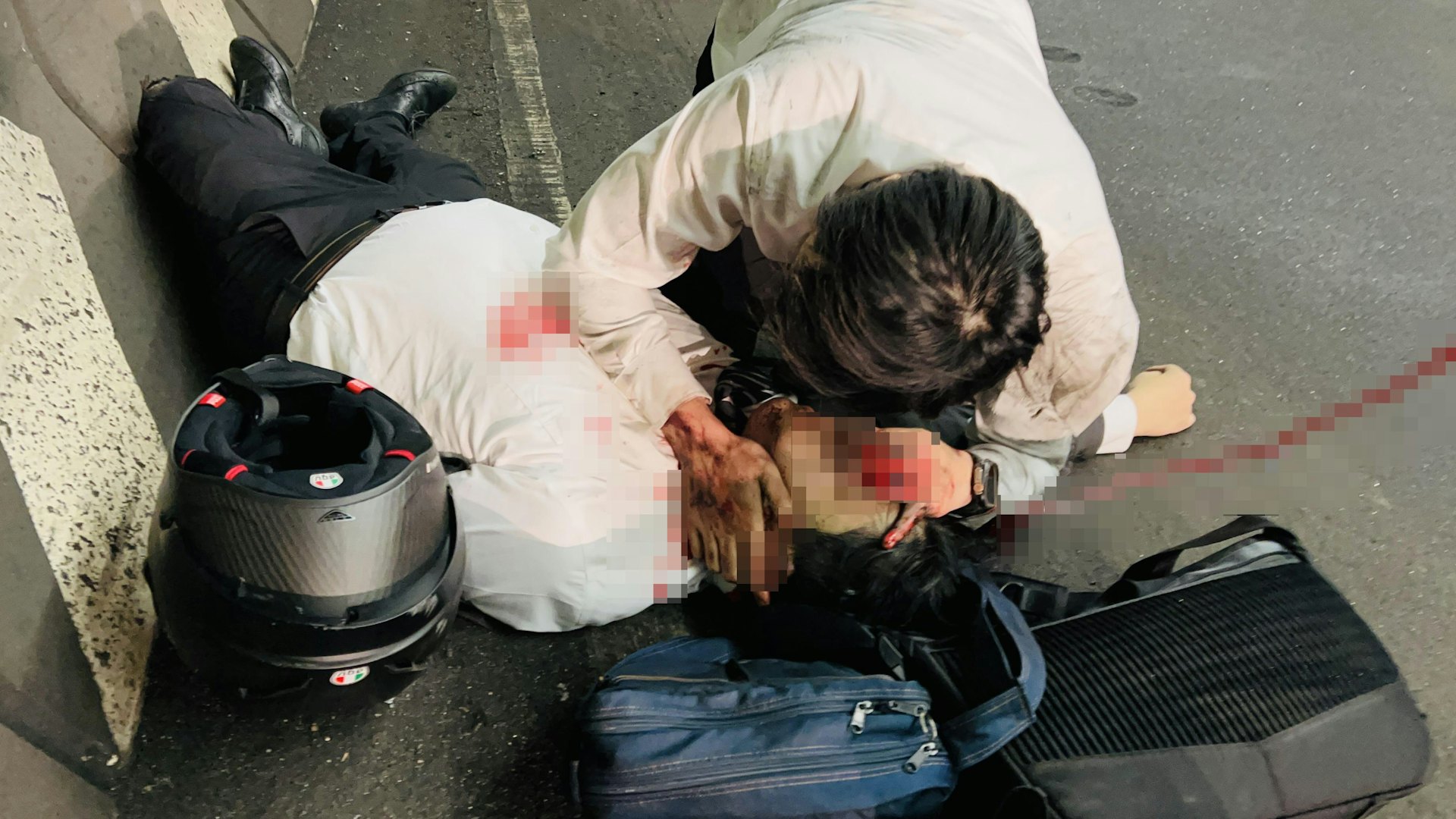 6 @) X3 W: D( N5 K. l: F# u% I, F公仔箱論壇車禍發生後,穿西裝的男乘客昏迷倒臥地上,頸部位置有血跡;同樣穿西裝的司機左衣袖破損,相信同告受傷,他負傷為傷者人工呼吸和心肺復甦(CPR)急救,其間呼喊對方名字,相當焦急。惟乘客一直沒有反應,現場遺下血跡,其他司機見狀下車協助報警,事後司機和乘客分別送往伊利沙伯醫院和廣華醫院,乘客傷重死亡。