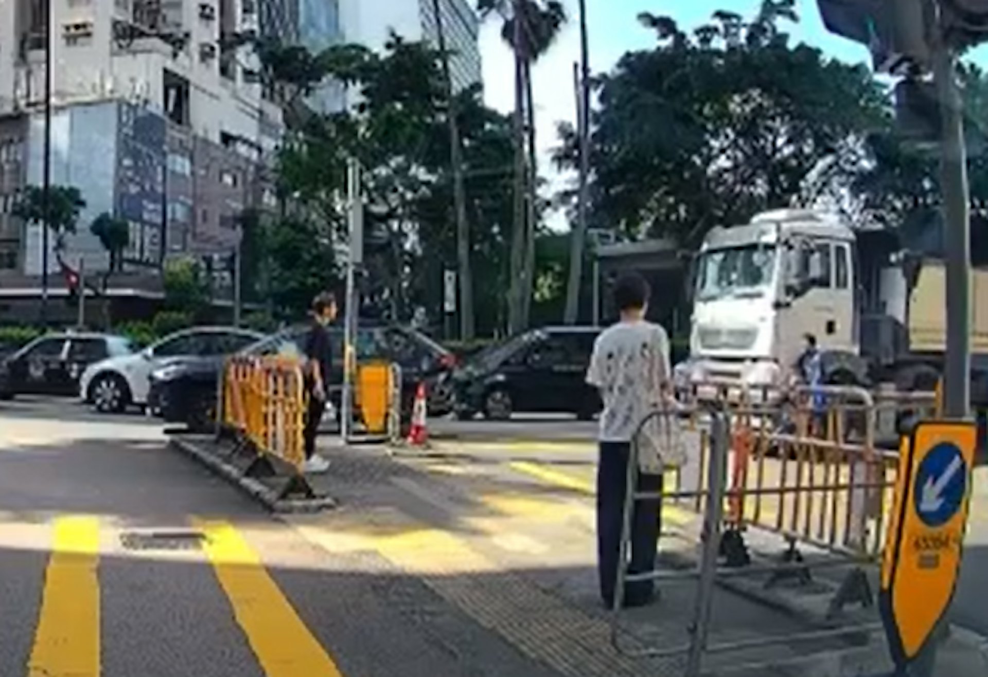 有等候過路的途人見狀後受驚,馬上轉身掩耳。(影片截圖)" }% f* u2 I; b* H3 `