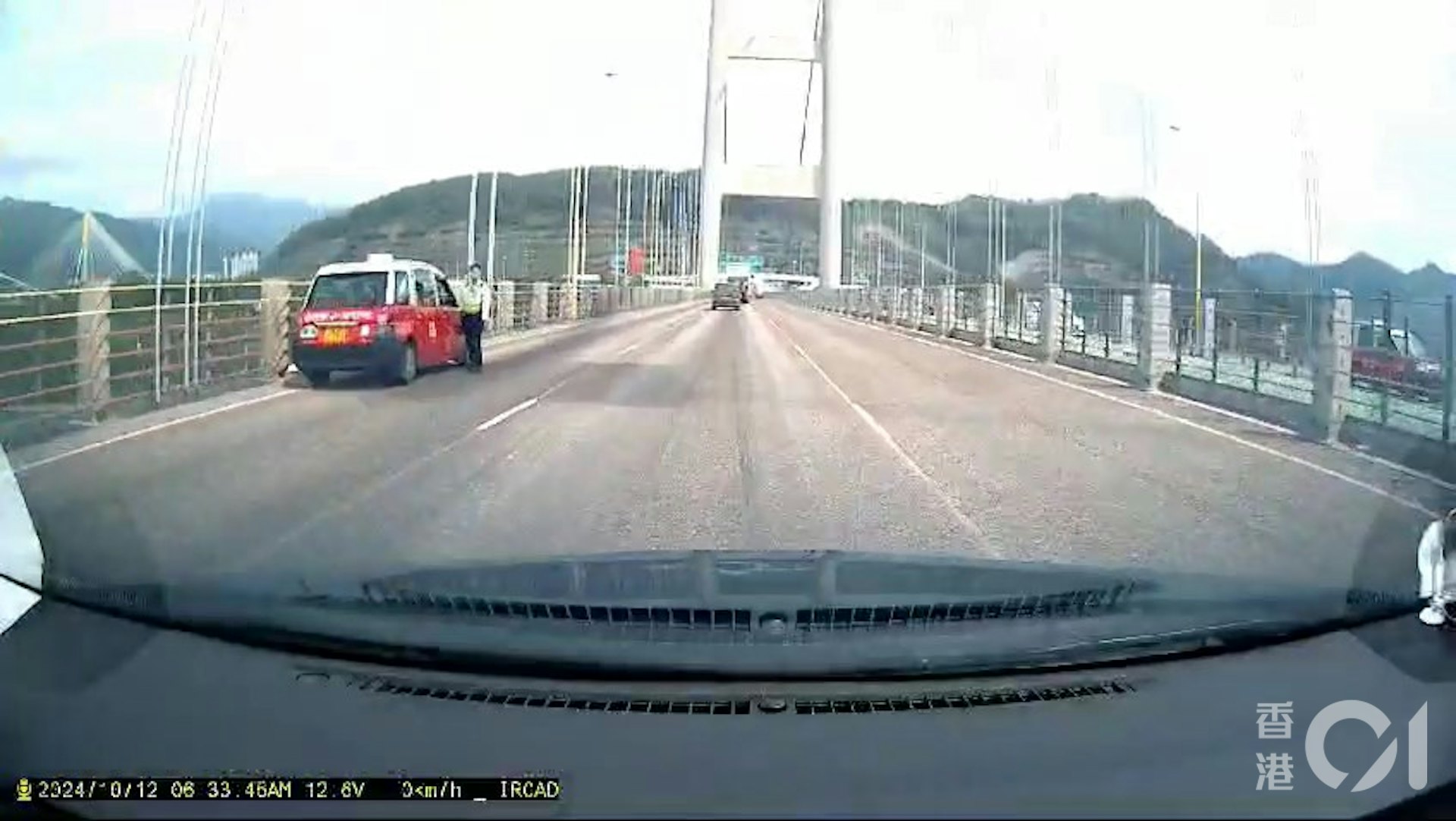 " ^2 _" R- d6 i9 K: {公仔箱論壇工程車前面近20米有一輛的士,車旁有一名工作人員。(網上影片截圖)