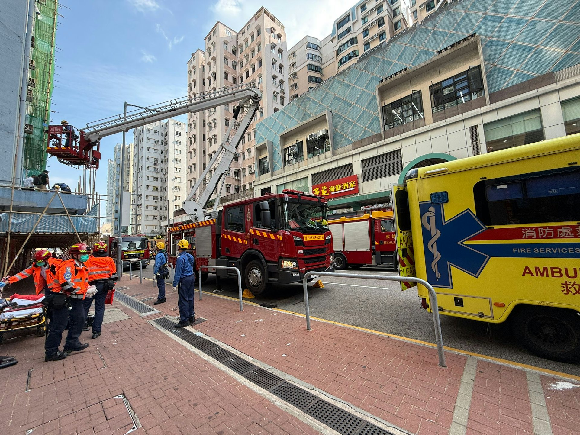 事發地點附近舖頭街坊陳先生目擊經過,見到事主在接近棚架頂頭部位置,連人帶兩支竹及狗臂架墮至大廈石屎簷篷,頭部著地,立即報警。警方及消防在1分鐘後已趕至現場,消防升起雲梯登上簷篷救人,事主頭部浴血、手部骨折,獲救回地面時已陷昏迷,救護員隨即以心外壓機施救,並將他送院,整個救援過程歷時約10分鐘。現場有其他工人在不同位置工作,事後協助警方調查。陳表示「個狗臂架都跌埋」,稱事主獲救時不見有救生繩。